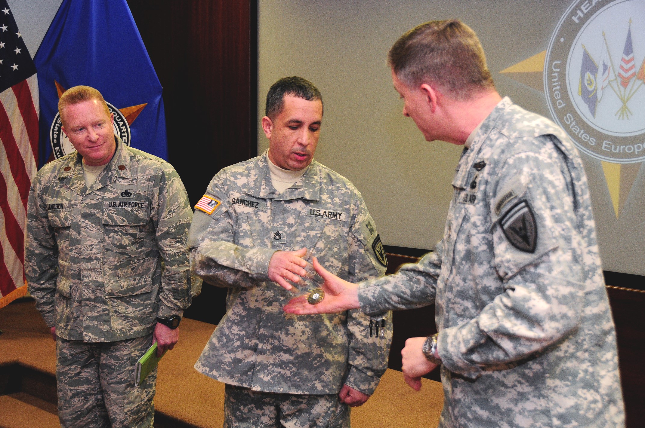 U.S. European Command Deputy Commander Lt. Gen. William Garrett III presents a coin to Staff Sergeant Amador Sanchez, current operations NCOIC, for outstanding performance.