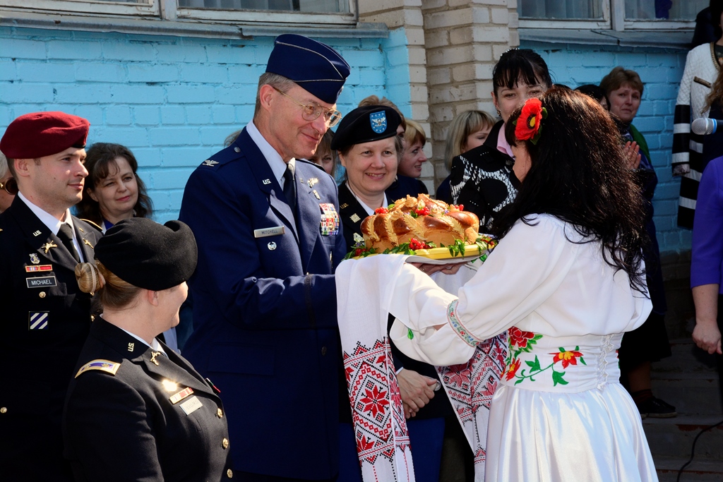 Col. John Mitchell, U.S. European Command surgeon general, receives a ceremonial gift of bread during the start of a ceremony at School #16 April 27, 2015. The school received office furniture, such as desks, tables and chairs donated by U.S. Department of Defense, European Command (EUCOM) in cooperation with the Office of Defense Cooperation (ODC), United States Agency for International Development (USAID), and Ukraine. The property transfer coordination began in 2012 at EUCOM to provide infrastructure improvement for the school, which is attended by nearly 1,200 students. (U.S. European Command photo by Master Sgt. Charles D. Larkin Sr./RELEASED)