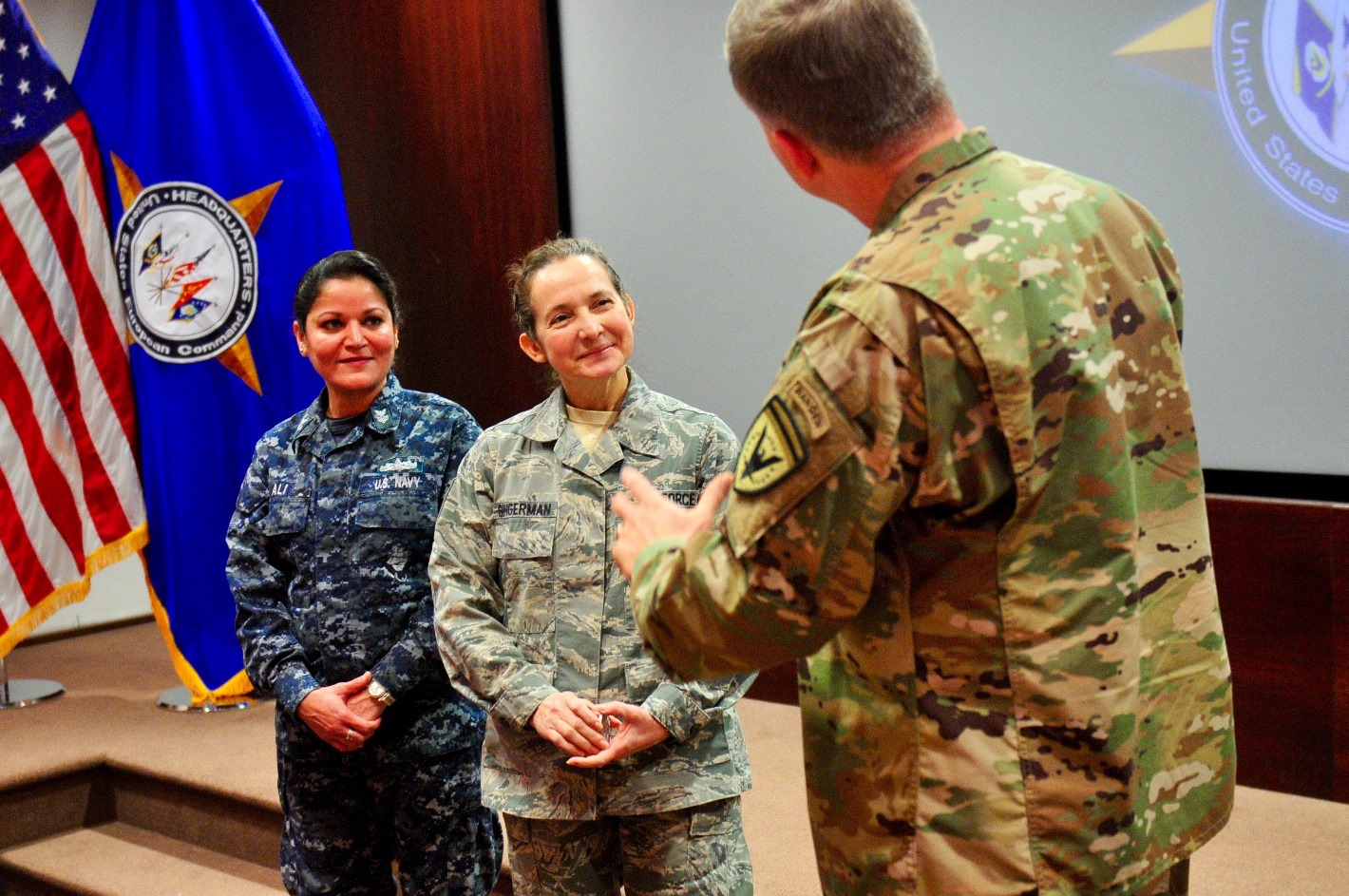 U.S. European Command Deputy Commander Lt. Gen. William Garrett III presents a coin to PO1 Riva Ali, left, and Master Sgt. Alicia Singerman, Secretary of the Joint Staff, for their outstanding duty performance.