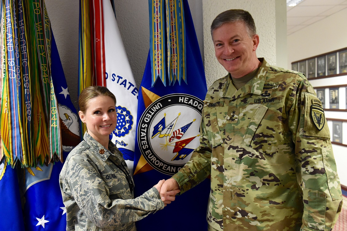 U.S. European Command Deputy Commander Lt. Gen. W. Burke Garrett III presents a coin to Maj. Wendy Quick, Chief of Special Activities Operations Center, for outstanding duty performance Apr. 15, 2016.