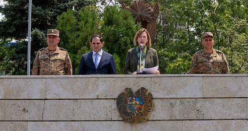 U.S. Ambassador to Armenia, Kristina A. Kvien, gives a speech during bilateral exercise Eagle Partner 24 opening ceremony at Yerevan, Armenia, July 15, 2024. Eagle Partner 24 plays a crucial role in reinforcing and strengthening the strategic relationship between the U.S. and Armenia, ensuring that both nations are better prepared to address common security challenges and work together towards shared goals. (U.S. Army photo by Spc. Alexcia Rupert)