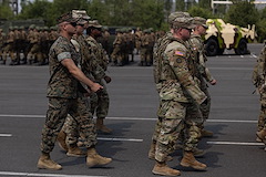 U.S. Army Soldiers and Marines march in formation during exercise Eagle Partner 24 at Yerevan, Armenia, July 15, 2024. Eagle Partner 24 is a collaborative exercise between the U.S. Army and Armenian Armed Forces, focused on boosting interoperability and enhancing their joint capabilities for peacekeeping and stability missions, reflecting their shared commitment to maintaining peace and security. (U.S. Army photo by Spc. Alexcia Rupert)