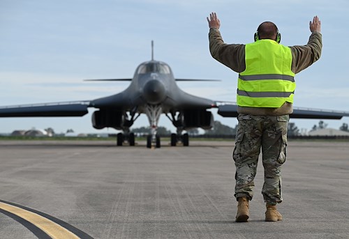 Senior Airman Luke Beauchemin, 9th Expeditionary Bomb Squadron crew chief, marshals in a B-1B Lancer assigned to Dyess Air Force Base, Texas, at Morón Air Base, Spain, during Bomber Task Force Europe April 19, 2024. Airmen from the 9th EBS along with two B-1B Lancers completed a trilateral integration with the Ghanaian Air Force and Army, and both United Kingdom and U.S. special forces in support of exercise Flintlock and BTF Europe. (U.S. Air Force photo by Staff Sgt. Holly Cook)