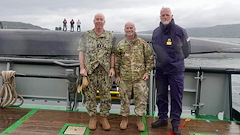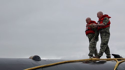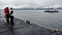 Sailors assigned to the U.S. Navy Ohio-class ballistic missile submarine, USS Tennessee (SSBN 734), watch the SD Raasay approach for debarking of personnel after a distinguished visitor tour of the ship off the northwest coast of the U.K., July 16, 2023. U.S. Army Gen. Christopher G. Cavoli, commander of U.S. European Command, U.S. Navy Vice Adm. William Houston, commander of Allied Submarine Command, and U.K. Royal Navy Commodore Paul Dunn, commodore Submarine Service, toured the U.S. Navy Ohio-class ballistic missile submarine to advance Allied cooperation and coordination.