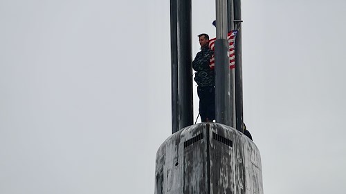 U.S. Navy Cmdr. Anthony Wilson, commanding officer of the Ohio-class ballistic missile submarine USS Tennessee (SSBN 734), observes debarking operations from the watch tower following a capabilities demonstration off the northwest coast of the U.K., July 16, 2023. U.S. Army Gen. Christopher G. Cavoli, commander of U.S. European Command, U.S. Navy Vice Adm. William Houston, commander of Allied Submarine Command, and U.K. Royal Navy Commodore Paul Dunn, commodore Submarine Service, toured the Tennessee to advance Allied cooperation and coordination.