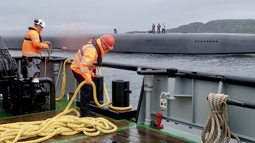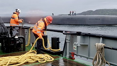 Crew members of the supply tender SD Raasay, of the British Underwater Test and Evaluation Centre (BUTEC), begin procedures to support an embark with the U.S. Navy Ohio-class ballistic missile submarine, USS Tennessee (SSBN 734), off the northwest coast of the U.K., July 16, 2023. The purpose of Cavoli's visit was to further the bilateral military coordination with the U.K., underscore U.S. commitment to its Allies, and support assurance and deterrence objectives.