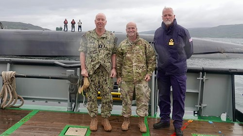 (Left to right) U.S. Navy Vice Adm. William Houston, commander of Allied Submarine Command, U.S. Army Gen. Christopher G. Cavoli, commander of U.S. European Command, and U.K. Royal Navy Commodore Paul Dunn, commodore Submarine Service, toured the U.S. Navy Ohio-class ballistic missile submarine, USS Tennessee (SSBN 734), off the northwest coast of the U.K., July 16, 2023. The purpose of Cavoli's visit was to further the bilateral military coordination with the U.K., underscore U.S. commitment to its Allies, and support assurance and deterrence objectives.