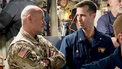 U.S. Navy Cmdr. Anthony Wilson, commanding officer of USS Tennessee (SSBN 734) (right), briefs U.S. Army Gen. Christopher G. Cavoli, commander of U.S. European Command, on diving procedures during a tour of the U.S. Navy Ohio-class ballistic missile submarine off the northwest coast of the U.K., July 16, 2023. SSBNs, such as the USS Tennessee, support the U.S. ability to maintain a strong, credible, survivable strategic force and contribute to a combined regional deterrence.