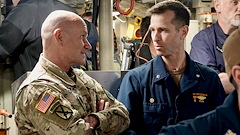 U.S. Army Gen. Christopher G. Cavoli (left), commander of U.S. European Command, and U.S. Navy Vice Adm. William Houston, commander of Allied Submarine Command, walk across the topside of the U.S. Navy Ohio-class ballistic missile submarine, USS Tennessee (SSBN 734), off the northwest coast of U.K., July 16, 2023. The USS Tennessee is a launch platform for submarine-launched ballistic missiles, providing the U.S. with its most survivable leg of the nuclear triad.