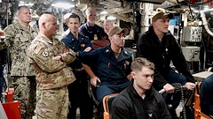 U.S. Army Gen. Christopher G. Cavoli (left), commander of U.S. European Command, U.S. Navy Cmdr. Anthony Wilson, commanding officer of USS Tennessee (SSBN 734), and his staff watch monitoring systems during a dive aboard the Ohio-class ballistic missile submarine during a dive off the northwest coast of the U.K., July 16, 2023. SSBNs, which patrol continuously, provide a critical, stabilizing, survivable and highly effective element of the U.S. nuclear deterrence force.