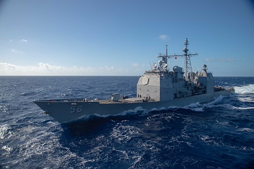 211209-N-DN159-1112 ATLANTIC OCEAN (Dec. 9, 2021) The Ticonderoga-class guided missile cruiser USS San Jacinto (CG 56) transits alongside the Nimitz-class aircraft carrier USS Harry S. Truman (CVN 75) during a replenishment-at-sea. The Harry S. Truman Carrier Strike Group is on a scheduled deployment in the U.S. Sixth Fleet area of operations in support of U.S. national interests, security, and stability in Europe and Africa. (U.S. Navy Photo by Mass Communication Specialist 3rd Class Crayton Agnew)