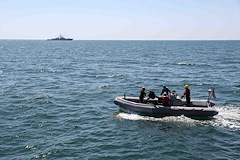 BLACK SEA (July 9, 2021) Sailors assigned to the Arleigh Burke-class guided-missile destroyer USS Ross (DDG 71) prepare to transfer passengers between ships using a rigid-hull inflatable boat during Exercise Sea Breeze in the Black Sea, July 9, 2021. Exercise Sea Breeze is a multinational maritime exercise cohosted by U.S. Sixth Fleet and the Ukrainian Navy in the Black Sea since 1997. Sea Breeze 2021 is designed to enhance interoperability of participating nations and strengthen maritime security and peace within the region. (U.S. Navy photo by Mass Communication Specialist 2nd Class Claire DuBois/Released)