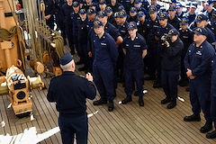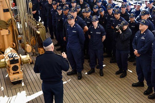 Cadets aboard USCGC Eagle (WIX 327), "America's Tall Ship," listen as Vice Adm. Steven Poulin, commander U.S. Coast Guard Atlantic Area, addresses them in Reykjavik, Iceland, on June 12, 2021. Eagle is currently conducting summer U.S. Coast Guard Academy cadet training in at-sea leadership and professional development, first visiting Portugal, now Iceland, followed by Bermuda, while Vice Adm. Poulin conducts several meetings abroad, including this visit to key partners in Iceland. (Photo courtesy U.S. Embassy Reykjavik, Kristjan Petersson)
