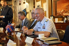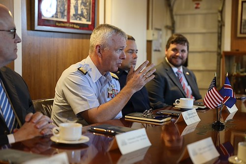 Vice Adm. Steven Poulin, commander U.S. Coast Guard Atlantic Area, joined by Jonathan Moore, principal deputy assistant secretary, Bureau of Oceans and International Environmental and Scientific Affairs, meets with Commodore Asgrimur Asgrimsson of the Icelandic coast guard, Chargé d'Affaires Harry Kamian, and Byrndis Kjartansdottir, director of security and defense directorate in the Icelandic Ministry of Foreign Affairs aboard USCGC Eagle (WIX 327), "America's Tall Ship," in Reykjavik, Iceland, June 12, 2021. (Photo courtesy U.S. Embassy Reykjavik, Kristjan Petersson)