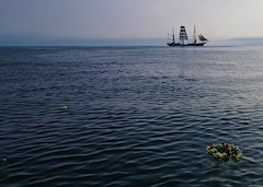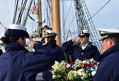 On approach to Iceland on June 6, 2021, the USCGC Eagle (WIX 3287) crew conducted a wreath-laying in memory of the Treasury-class USCGC Hamilton (WPG 34), torpedoed by German submarine U-132 in 1942, while patrolling the Icelandic coast near Reykjavík. Of the 221 person crew, 26 members were lost. (U.S. Coast Guard photo courtesy USCGC Eagle)