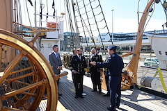 Capt. Michael Turdo, commanding officer of USCGC Eagle (WIX 327), provides a tour to Commodore Asgrimur Asgrimsson of the Icelandic coast guard, Chargé d'Affaires Harry Kamian, and Byrndis Kjartansdottir, director of security and defense directorate in the Icelandic Ministry of Foreign Affairs and other officials aboard Eagle in Reykjavik, Iceland, June 12, 2021. Eagle is currently conducting summer U.S. Coast Guard Academy cadet training in at-sea leadership and professional development. Their last visit to Iceland was in 2011. (Photo courtesy U.S. Embassy Reykjavik, Kristjan Petersson)