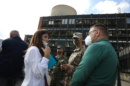 Members of the Ministry for Environment talk with members of the Kosovo Security Forces CBRNE (Chemical, Biological, Radiological, Nuclear, and Explosives), the NATO advisory liaison team Oct. 1, 2020 at a chemical storage unit in Obilic/Obiliq, Kosovo to discuss environmental and chemical safety.