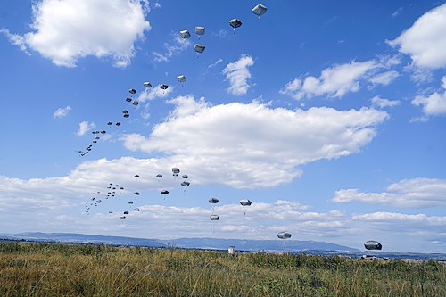U.S. paratroopers, assigned to the 173rd Airborne Brigade, begin their landing at the drop zone during the Noble Partner 20 exercise at Vaziani Training Area, Georgia, Sept. 1, 2020. Exercise Noble Partner is designed to enhance regional partnerships and increase U.S. force readiness and interoperability in a realistic, multinational training environment. The exercise allows participants to conduct airborne operations, situational training exercises, live-fire exercises and combined mechanized maneuvers.