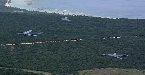 A U.S. Air Force B-52 Stratofortress, B-1 Lancer and B-2 Spirit fly over Guam after launching from Andersen Air Force Base, Guam, for an integrated bomber operation, Aug.17, 2016. This mission marks the first time in history that all three of Air Force Global Strike Command's strategic bomber aircraft are simultaneously conducting integrated operations in the U.S. Pacific Command area of operations. As of Aug. 15, the B-1 Lancer will be temporarily deployed to Guam in support of U.S. Pacific Command’s Continuous Bomber Presence mission. (U.S. Air Force photo by Tech. Sgt. Richard P. Ebensberger)