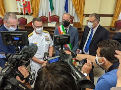 GAETA, Italy (June 17, 2020) - Rear Adm. Michael T. Curran, Fleet Supply, Logistics and Ordinance, N4, U.S. Naval Forces Europe/Africa/U.S. Sixth Fleet, leads a press conference with local media about the first of three donations of medical equipment and supplies to local Italian communities. U.S. 6th Fleet, headquartered in Naples, Italy, conducts the full spectrum of joint and naval operations, often in concert with Allied and interagency partners, in order to advance U.S. national interests and security and stability in Europe and Africa.