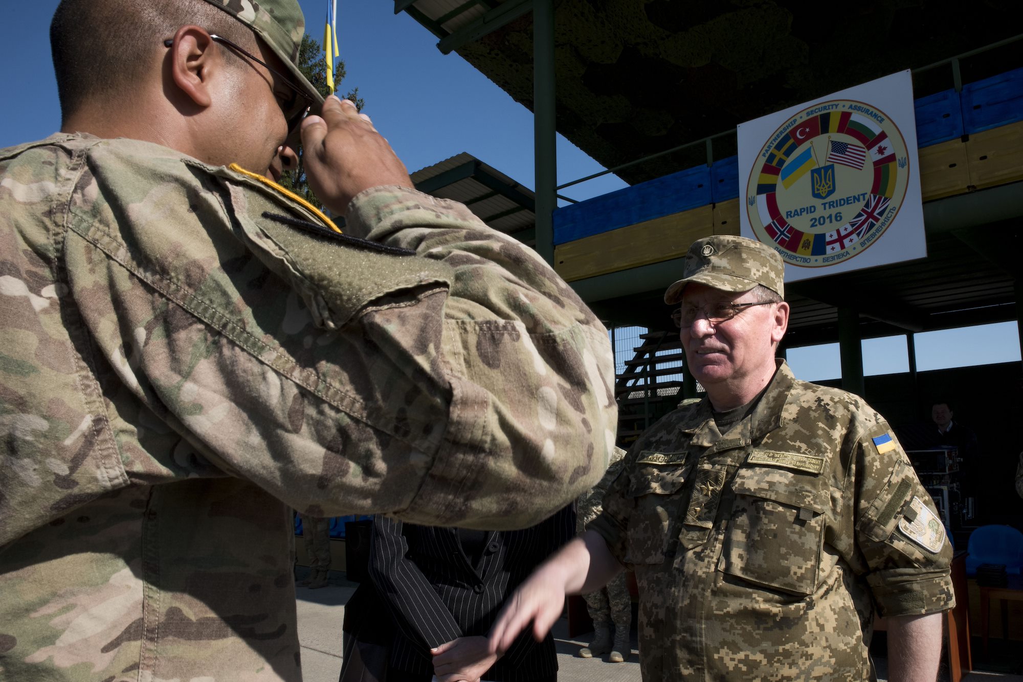 Ukrainian Lt. Gen. Pavlo Tkachuk, the Chief of the Ukrianian National Military Academy prepares to return the salute of a U.S. Soldier during the closing ceremony for Exercise Rapid Trident 16 in Yavoriv, Ukraine July 8, 2016. The exercise is a regional command post and field training exercise that involves about 2,000 Soldiers from 13 different nations, being held at the International Peacekeeping and Security Center in Yavoriv, Ukraine June 27 - July 8, 2016. (U.S. Army photo by Sgt. 1st Class Whitney Hughes/Released)