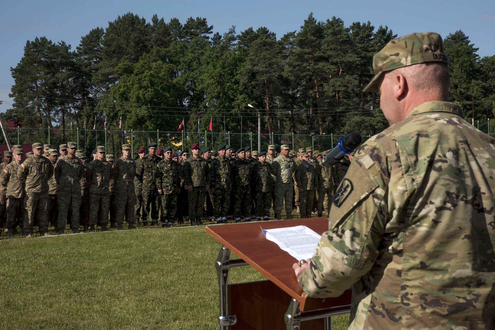 Col. Nick Ducich, the commander of the Joint Multinational Training Group – Ukraine addresses multinational Soldiers during the closing ceremony for Exercise Rapid Trident 16 in Yavoriv, Ukraine July 8, 2016. The exercise is a regional command post and field training exercise that involves about 2,000 Soldiers from 13 different nations, being held at the International Peacekeeping and Security Center in Yavoriv, Ukraine June 27 - July 8, 2016. (U.S. Army photo by Sgt. 1st Class Whitney Hughes/Released)