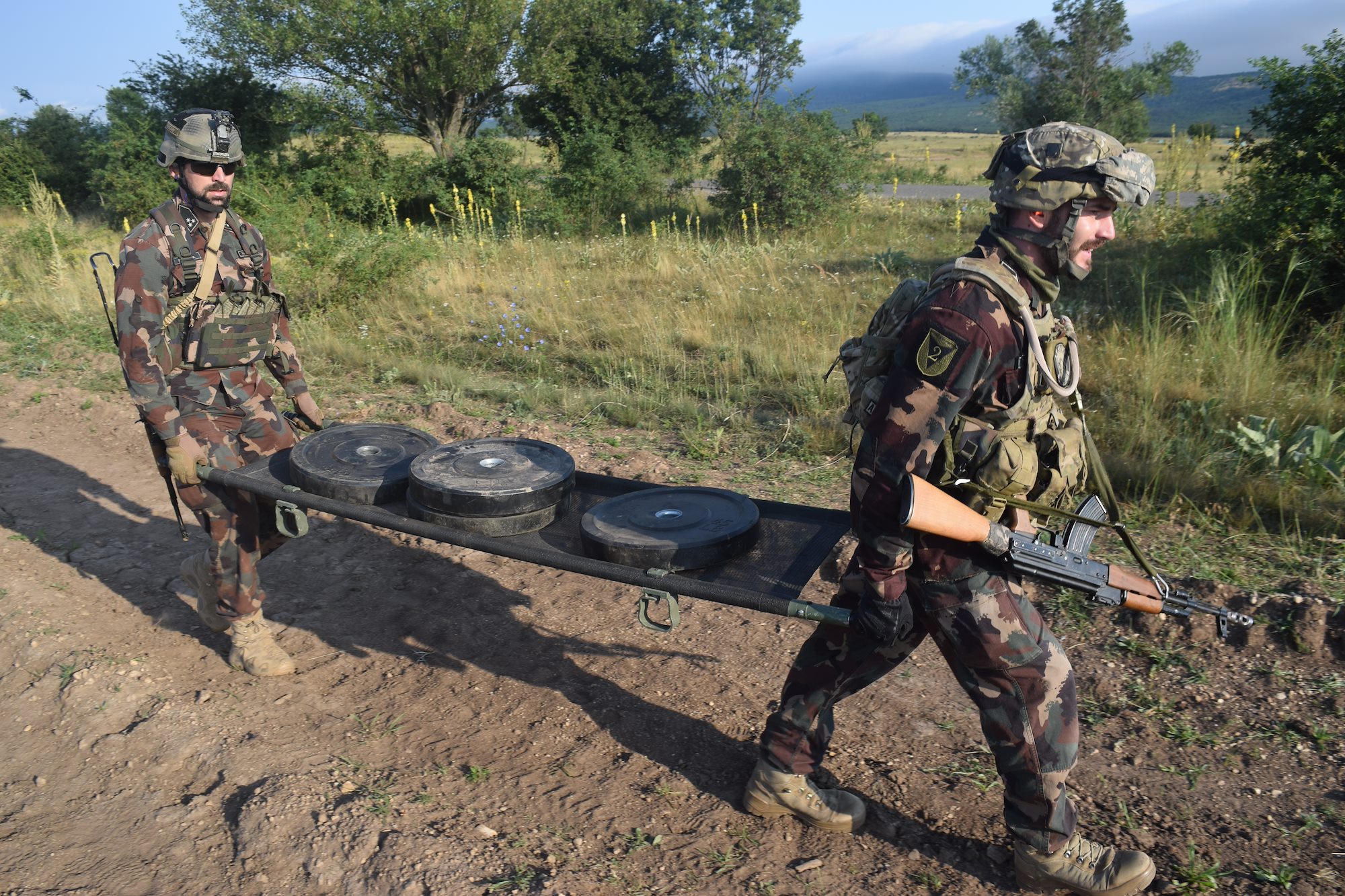 Hungarian Soldiers carry a weighted casualty litter to help elevate their heartrate before engaging targets during a stress shoot at Camp Ujamajor, Hungary July 13, 2016. The Troopers are in Hungary as a part of Operation Atlantic Resolve, a demonstration of continued U.S. commitment to the collective defense of Europe through a series of actions designed to reassure NATO allies and partners of our dedication to enduring peace and stability in the region.