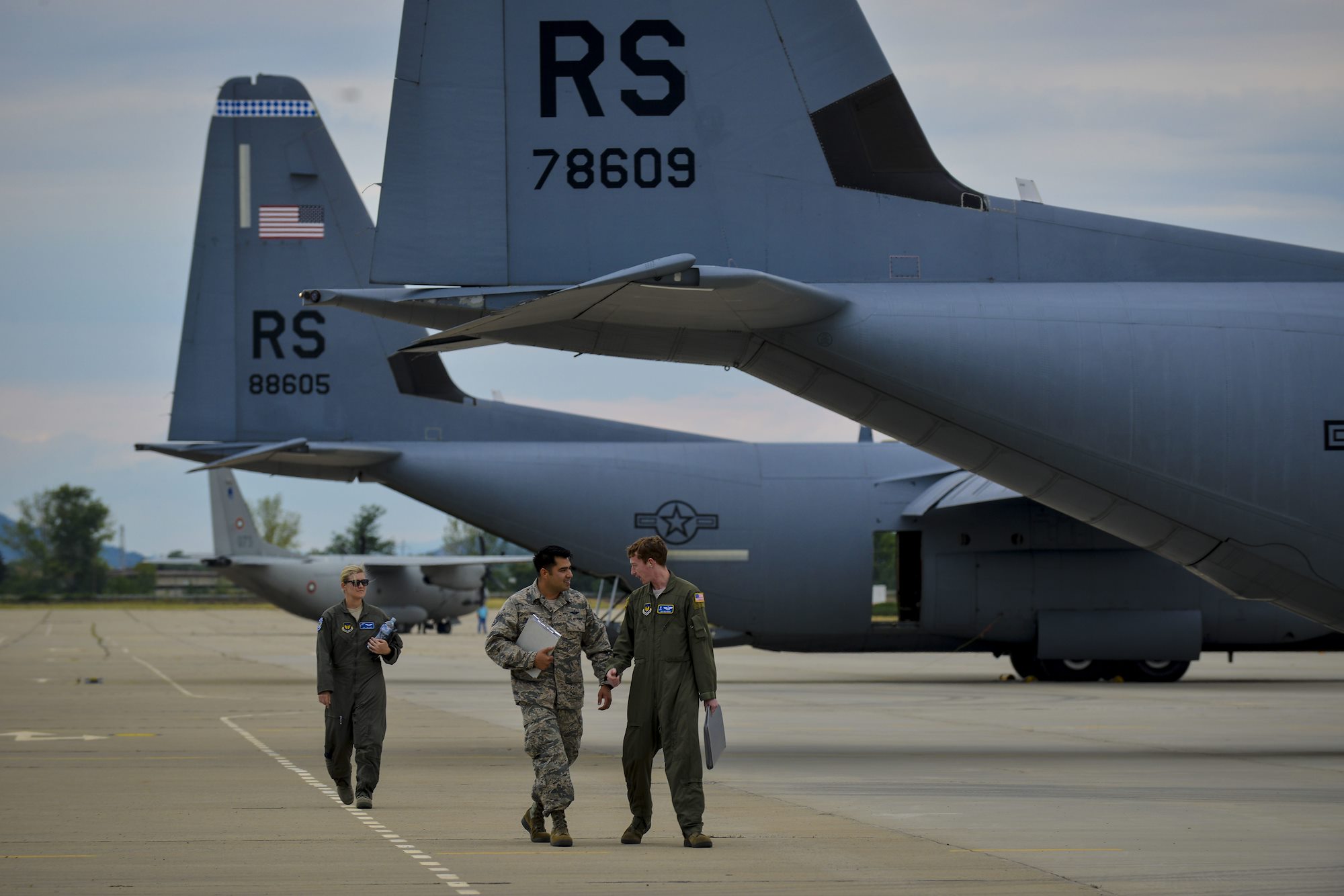 Airmen from the 37th Airlift Squadron inspect C-130J Super Hercules before a formation flight during Exercise Thracian Summer 2016 July 17, Plovdiv, Bulgaria. During the two-week forward training deployment, the 37th Airlift Squadron are conducting tactical flight training which include low-level flights, airdrop training with partnered forces and other related training events. The evolutions help preserve joint readiness, build interoperability and strengthen relationships with our NATO allies. (U.S. Air Force photo/Senior Airman Nicole Keim)