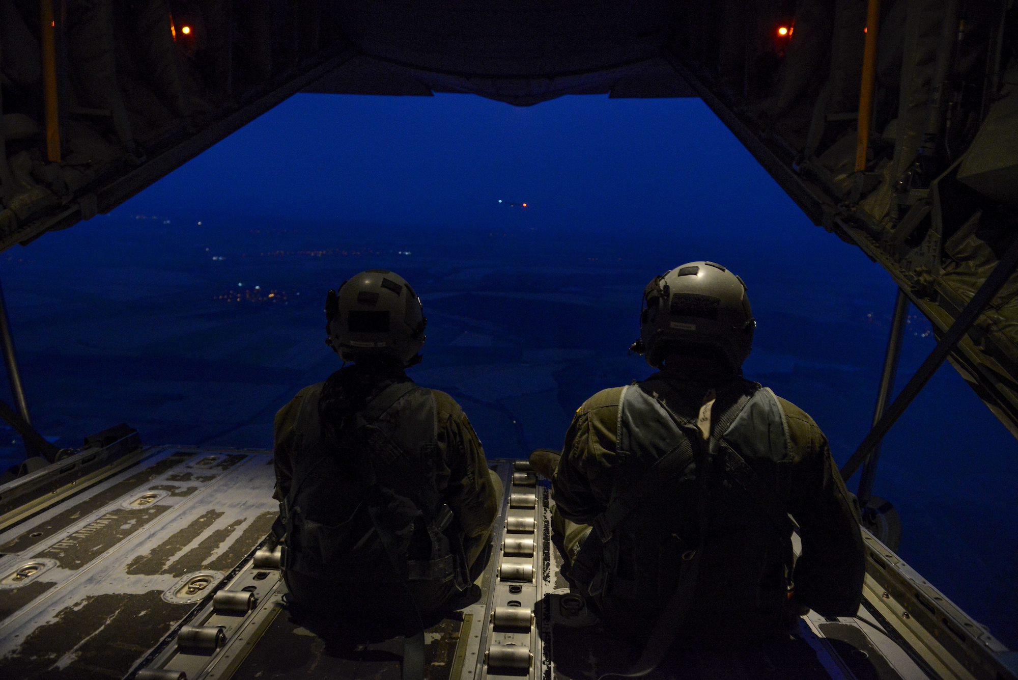 Senior Airman Emily Mitchell and Staff Sgt. Joshua Nelson, both 37th Airlift Squadron loadmasters sit on the ramp of a C-130J Super Hercules during a formation flight during Exercise Thracian Summer 2016 July 17, Plovdiv, Bulgaria. Through Exercise Thracian Summer, the U.S. and Bulgaria will enhance their mutual ability to work together, with other NATO nations, and with key partners on regional security (U.S. Air Force photo/Senior Airman Nicole Keim)