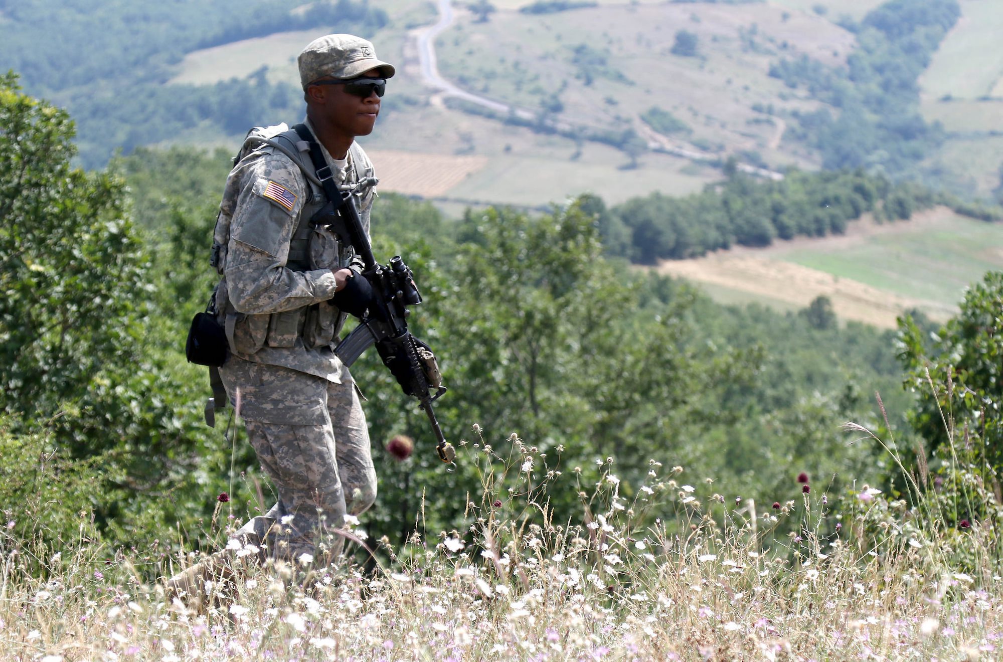 Pfc. Joshua Jones, an infantryman with the 1st Battalion, 41st Infantry Regiment, 2nd Infantry Brigade Combat Team, patrols a ridge line during a squad-level situational training exercise held in Dumnice, Kosovo, July 25, 2016. The purpose of the exercise was to train individual squad movements in preparation for a larger scale operation deemed Iron Eagle, later this year. (U.S. Army photo by: Staff Sgt. Thomas Duval, Multinational Battle Group-East Public Affairs)