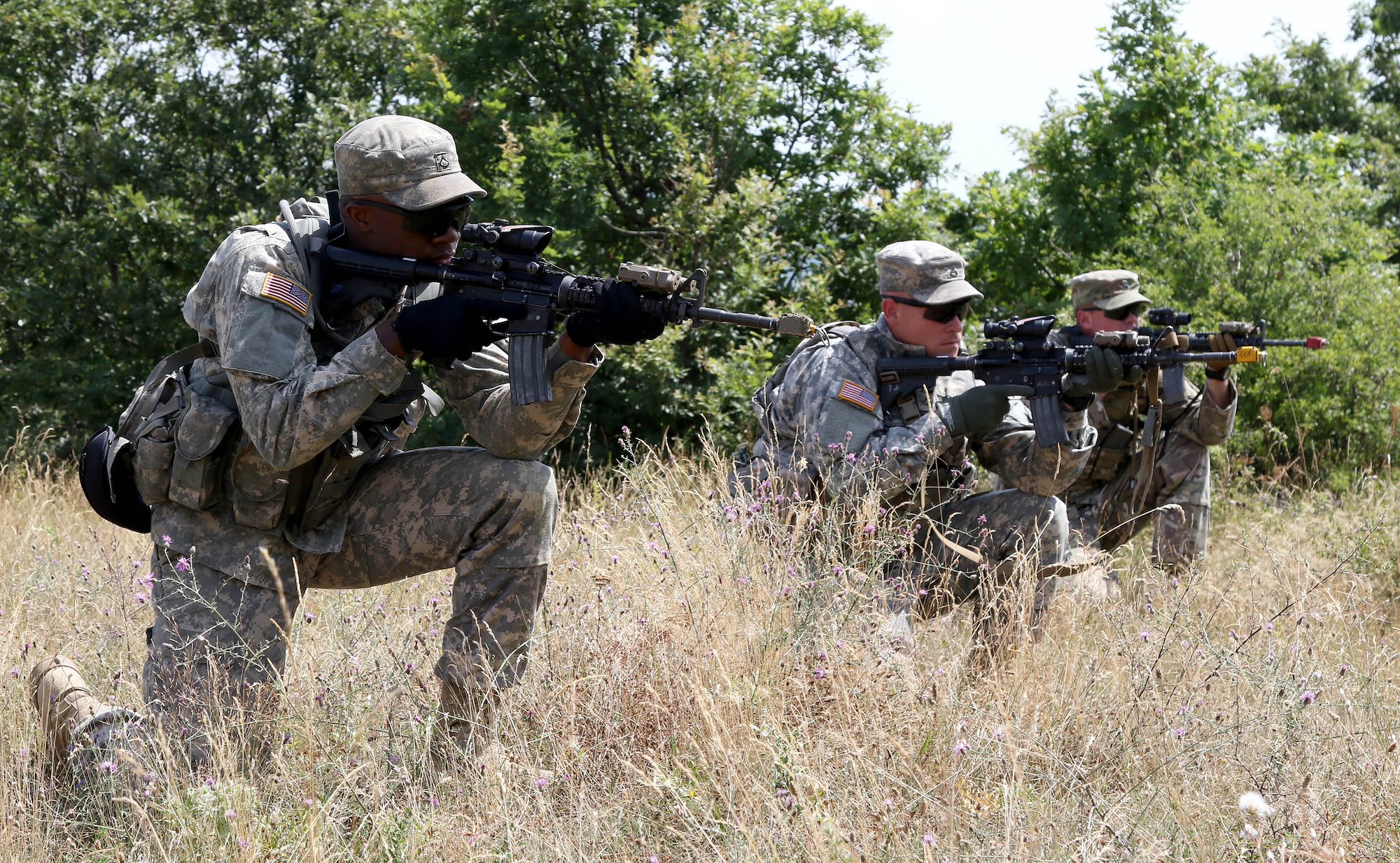 Soldiers from the 1st Battalion, 41st Infantry Regiment, 2nd Infantry Brigade Combat Team, get on line and engage an enemy target during a squad-level situational training exercise held in Dumnice, Kosovo, July 25, 2016. The purpose of the exercise was to train individual squad movements in preparation for a larger scale operation deemed Iron Eagle, later this year. (U.S. Army photo by: Staff Sgt. Thomas Duval, Multinational Battle Group-East Public Affairs)