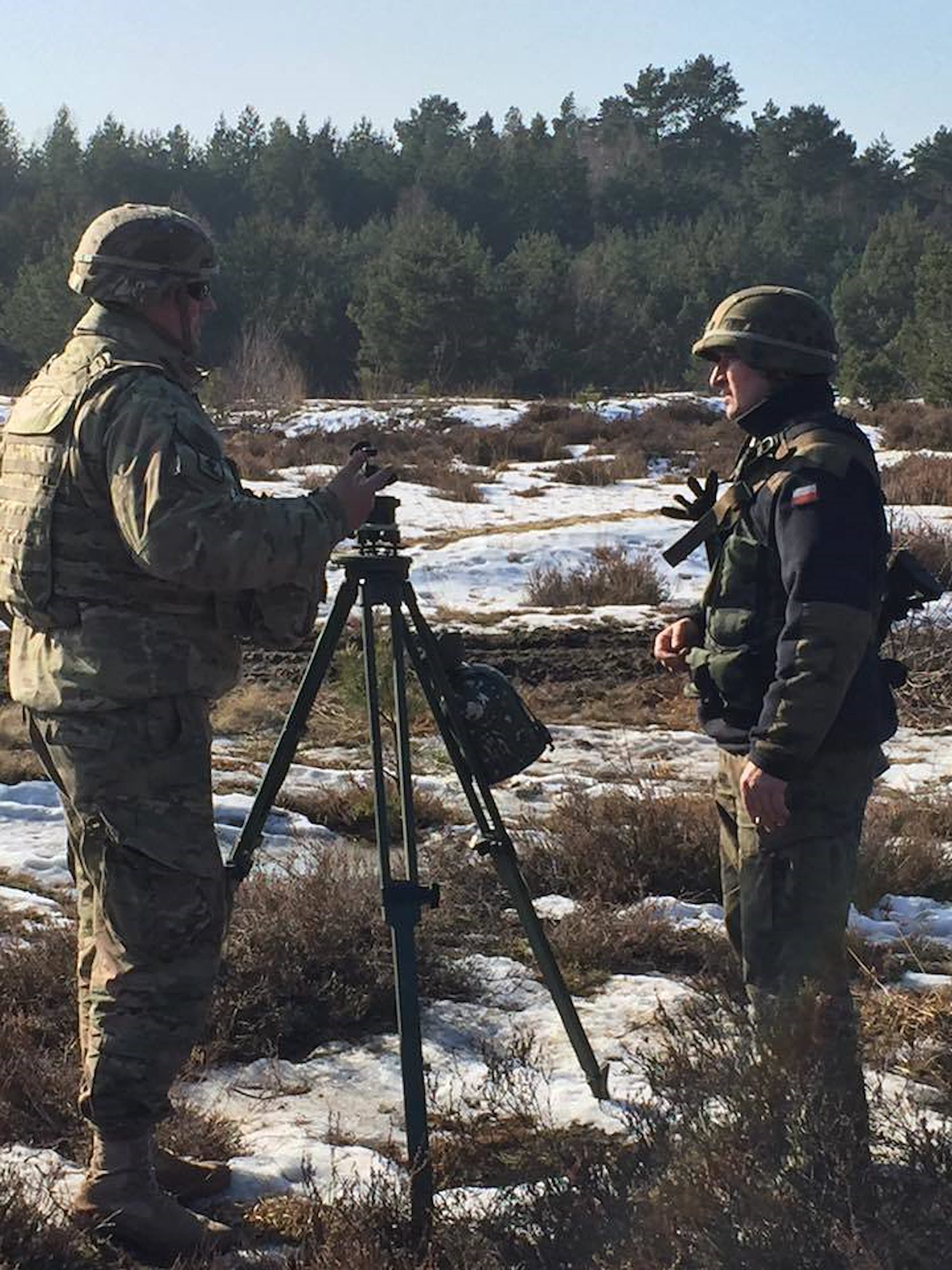Staff Sgt. Ryan Fasano, a mortarman with Troop “Blackfoot,” 4th Squadron, 10th Cavalry Regiment, 3rd Armored Brigade Combat Team, 4th Infantry Division, shows a Polish counterpart from the Polish 10th Armored Cavalry Brigade how he lays in mortars during the squadron’s Mortar Training and Evaluation Program exercise at Sweitoszow training area, Poland, Feb. 9, 2017. The fire support element, joint terminal attack controllers and troop mortar sections with 4th Sqdn., 10th Cav. Regt., continue to build interoperability with the Polish 10th Armored Cavalry Brigade through mutual training opportunities in support of U.S. Army Europe’s Atlantic Resolve. (U.S. Army photo by 2nd Lt. Micayla Westendorf, 3rd Armored Brigade Combat Team, 4th Infantry Division)