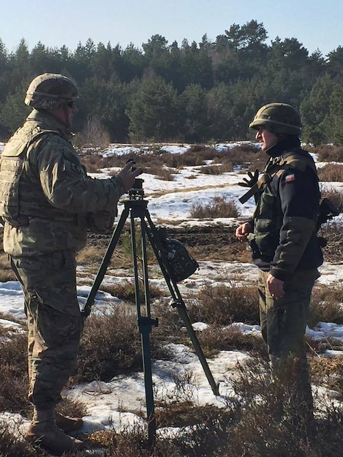 Capt. Daniel Allison (center), fire support officer for 4th Squadron, 10th Cavalry Regiment, 3rd Armored Brigade Combat Team, 4th Infantry Division, joins a joint terminal attack controller assigned to the unit and a Polish 10th Armored Cavalry Brigade soldier at an observation point for mortar firing during the squadron’s Mortar Training and Evaluation Program exercise at Sweitoszow training area, Poland, Feb. 9, 2017. The fire support element, joint terminal attack controllers and troop mortar sections with 4th Sqdn., 10th Cav. Regt., continue to build interoperability with the Polish 10th Armored Cavalry Brigade through mutual training opportunities in support of U.S. Army Europe’s Atlantic Resolve. (U.S. Army photo by 2nd Lt. Micayla Westendorf, 3rd Armored Brigade Combat Team, 4th Infantry Division)