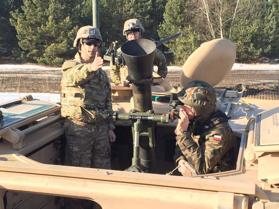 Mortarmen from “Blackfoot” Troop, 4th Squadron, 10th Cavalry Regiment, 3rd Armored Brigade Combat Team, 4th Infantry Division, instruct a soldier from the Polish 23rd Field Artillery Regiment on engaging targets from an M106 mortar carrier during the squadron’s Mortar Training and Evaluation Program exercise at Sweitoszow training area, Poland, Feb. 9, 2017. The fire support element, joint terminal attack controllers and troop mortar sections with 4th Sqdn., 10th Cav. Regt., continue to build interoperability with the Polish 10th Armored Cavalry Brigade by training together and seeking opportunities to operate each other's equipment while participating in U.S. Army Europe’s Atlantic Resolve. (U.S. Army photo by 2nd Lt. Micayla Westendorf, 3rd Armored Brigade Combat Team, 4th Infantry Division)