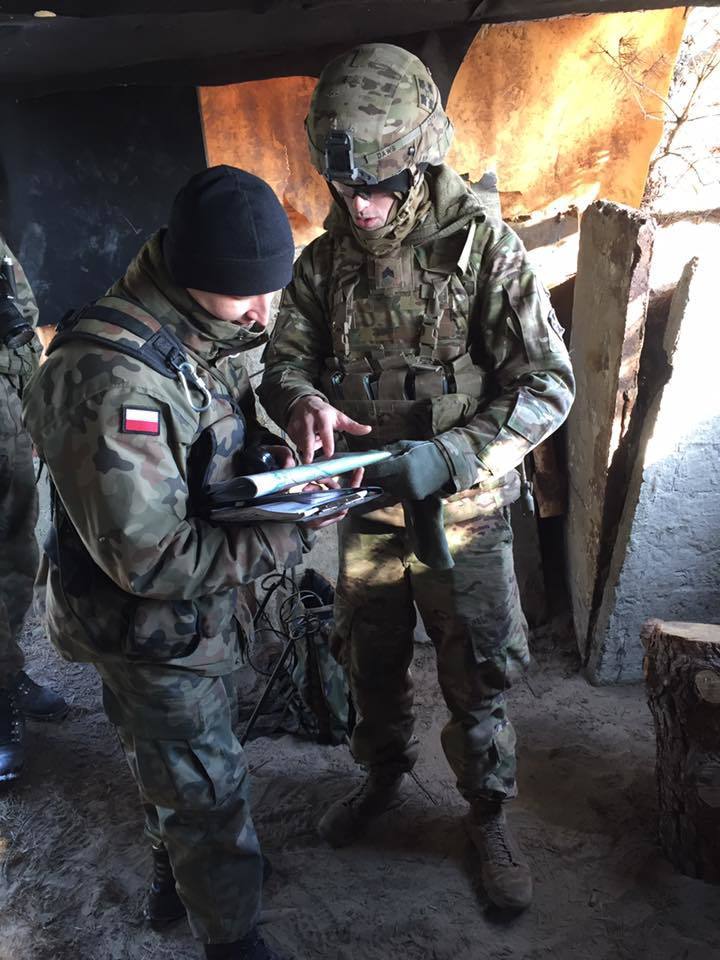Sgt. Corey Daws, a fire support team chief with Troop “Blackfoot,” 4th Squadron, 10th Cavalry Regiment, 3rd Armored Brigade Combat Team, 4th Infantry Division, goes over U.S. call for fire procedures with a Polish observer from the Polish 23rd Field Artillery Regiment during the squadron’s Mortar Training and Evaluation Program exercise at Sweitoszow training area, Poland, Feb. 9, 2017. The fire support element, joint terminal attack controllers and troop mortar sections with 4th Sqdn., 10th Cav. Regt., continue to build interoperability with the Polish 10th Armored Cavalry Brigade through mutual training opportunities in support of U.S. Army Europe’s Atlantic Resolve. (U.S. Army photo by 2nd Lt. Micayla Westendorf, 3rd Armored Brigade Combat Team, 4th Infantry Division)