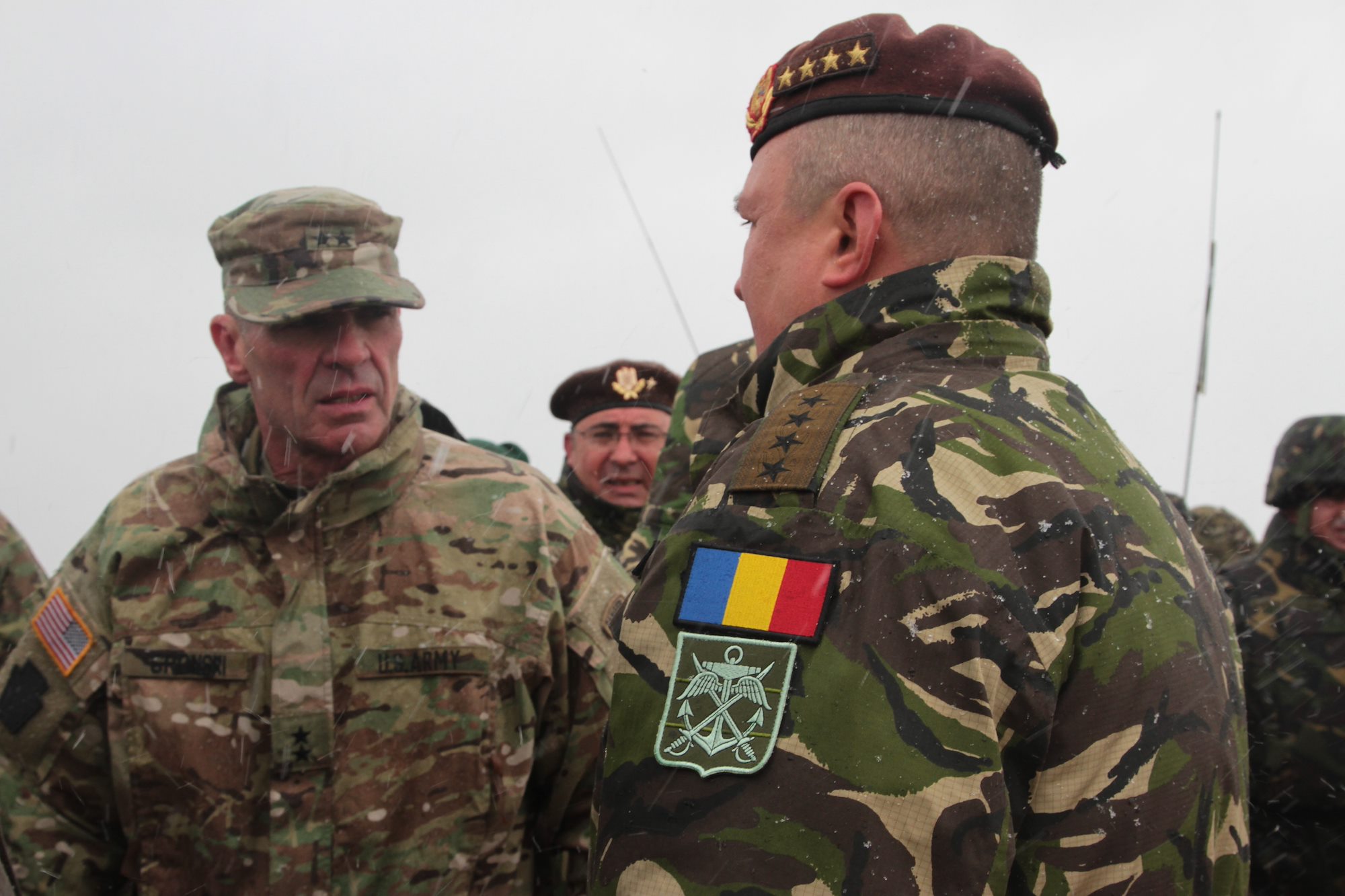 U.S. Maj. Gen. John Gronski, deputy commanding general for the Army National Guard, speaks with Romanian Maj. Gen. Nicolae Ciuca, the chief of the Romanian Land Forces Staff, during a live fire training exercise at Smardan Training Area on April 20, 2017. The training exercise is a testament to the success of Operation Atlantic Resolve, a NATO mission involving the US and its European Allies and partners in a combined effort to strengthen regional stability and promote peace in Europe. (Photo by Army Pvt. Nicholas Vidro, 7th Mobile Public Affairs Detachment)