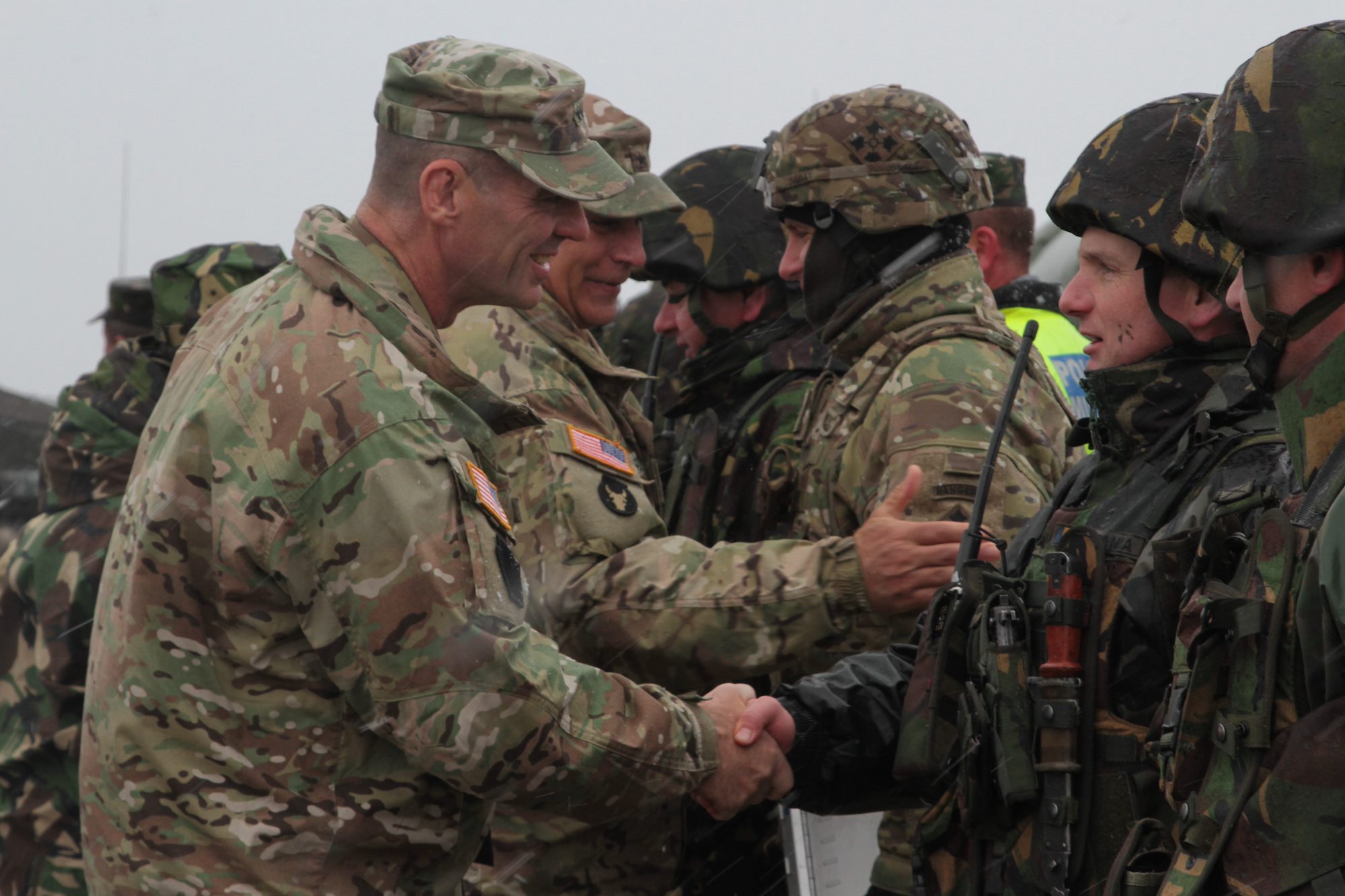 U.S. Maj. Gen. John Gronski, deputy commanding general for the Army National Guard, and U.S. Brig. Gen. Benjamin Corell, deputy commander of NATO's Multinational Division South-East, Bucharest, Romania, greet US and Romanian soldiers as they arrive at a live fire exercise conducted at Smardan Training Area on April 20, 2017. The exercise showcased the cohesion of U.S. and Romanian forces during Operation Atlantic Resolve, a NATO mission involving the U.S. and its European Allies and partners in a combined effort to strengthen bonds of friendship and deter aggression in Europe. (Photo by Army Pvt. Nicholas Vidro, 7th Mobile Public Affairs Detachment)