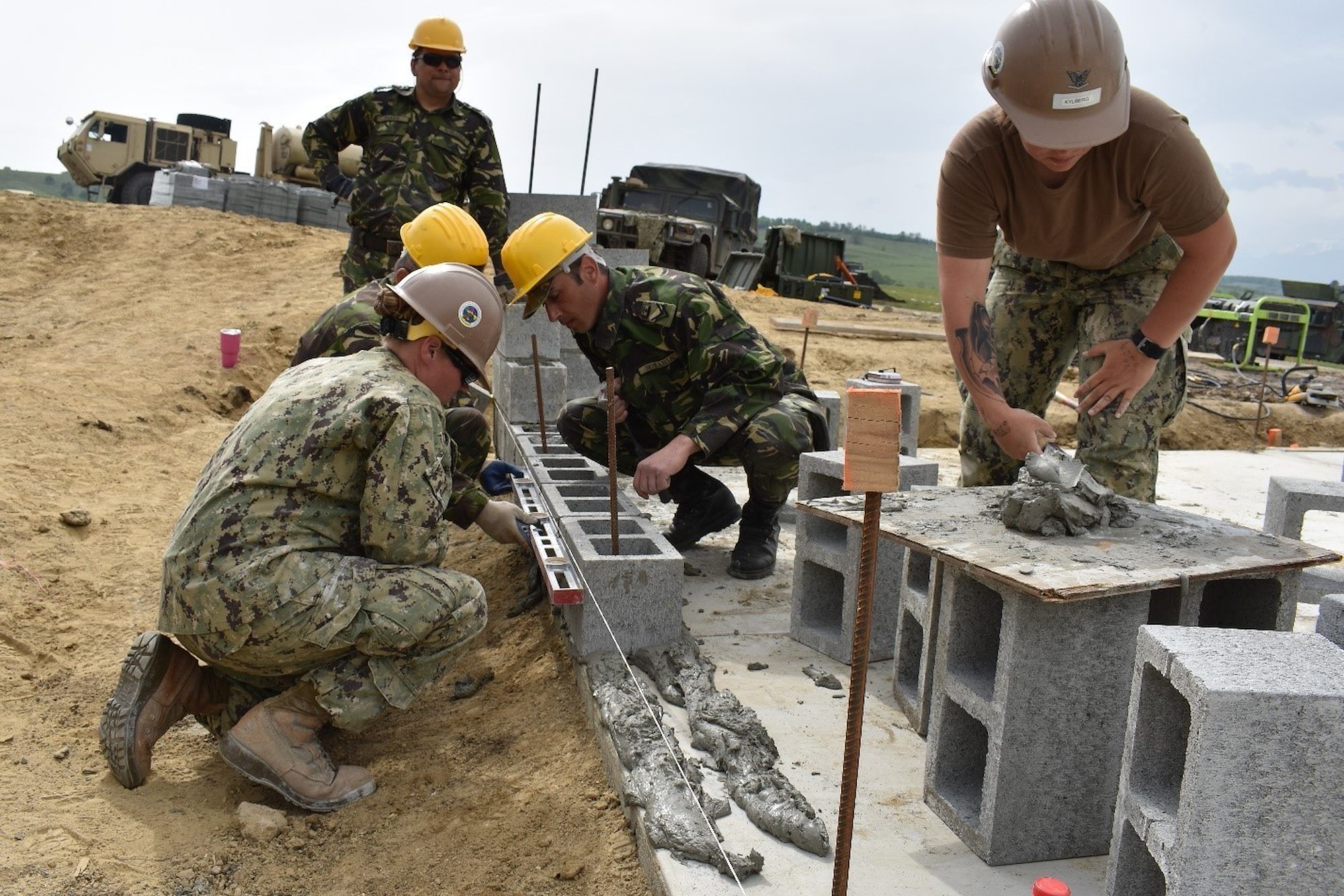Builder 3rd Class Alexis Franklin works with Corporals Giurca, Szabo, and Vagu from the Romanian 10th Engineer Brigade as they place concrete blocks for the wall of an Operations and Storage Building as a part of Resolute Castle 17 at Joint National Training Center, Cincu, Romania, while Builder 3rd Class Samantha Kylberg provides mortar. Resolute Castle 17 is an exercise strengthening the NATO alliance and enhancing its capacity for joint training and response to threats within the region.