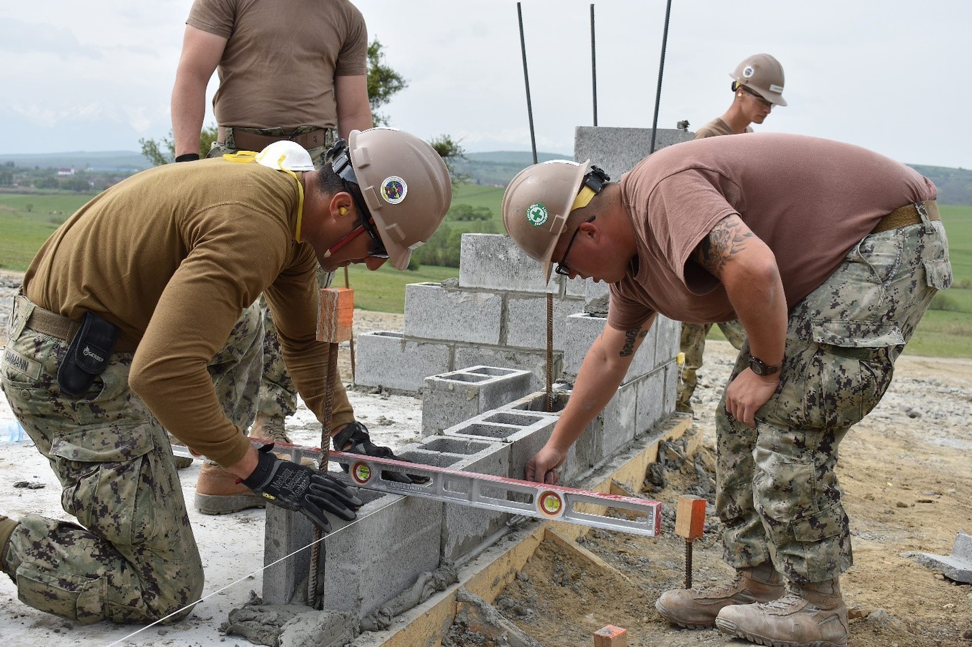 Builder 1st Class Jonathan French of San Antonio, TX, described their process for walling the Operations and Storage Building: “You start at the corners, build a pyramid, then lay the first course. We go up five levels, then start again.” Walling the building was a team effort, as the Seabees were joined by Soldiers from the 702nd Engineer Company, 391st Engineer Battalion, 926th Engineer Brigade and Romanian Soldiers from 10th Engineer Brigade. They have been working with the Romanian Soldiers for the entire project, building relationships and understanding and sharing laughs in between moving blocks and pouring concrete.
