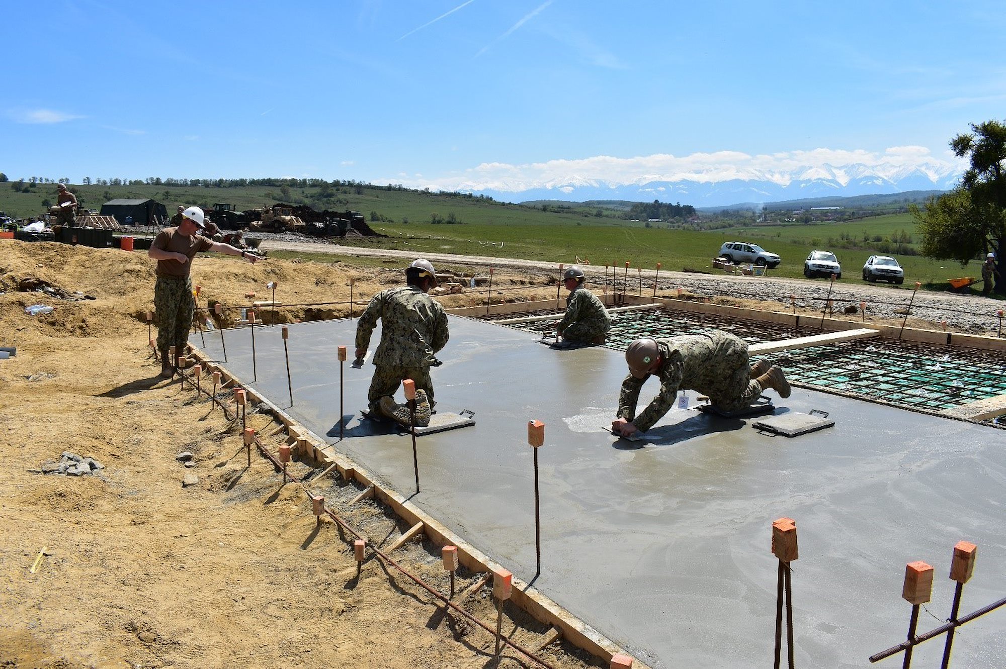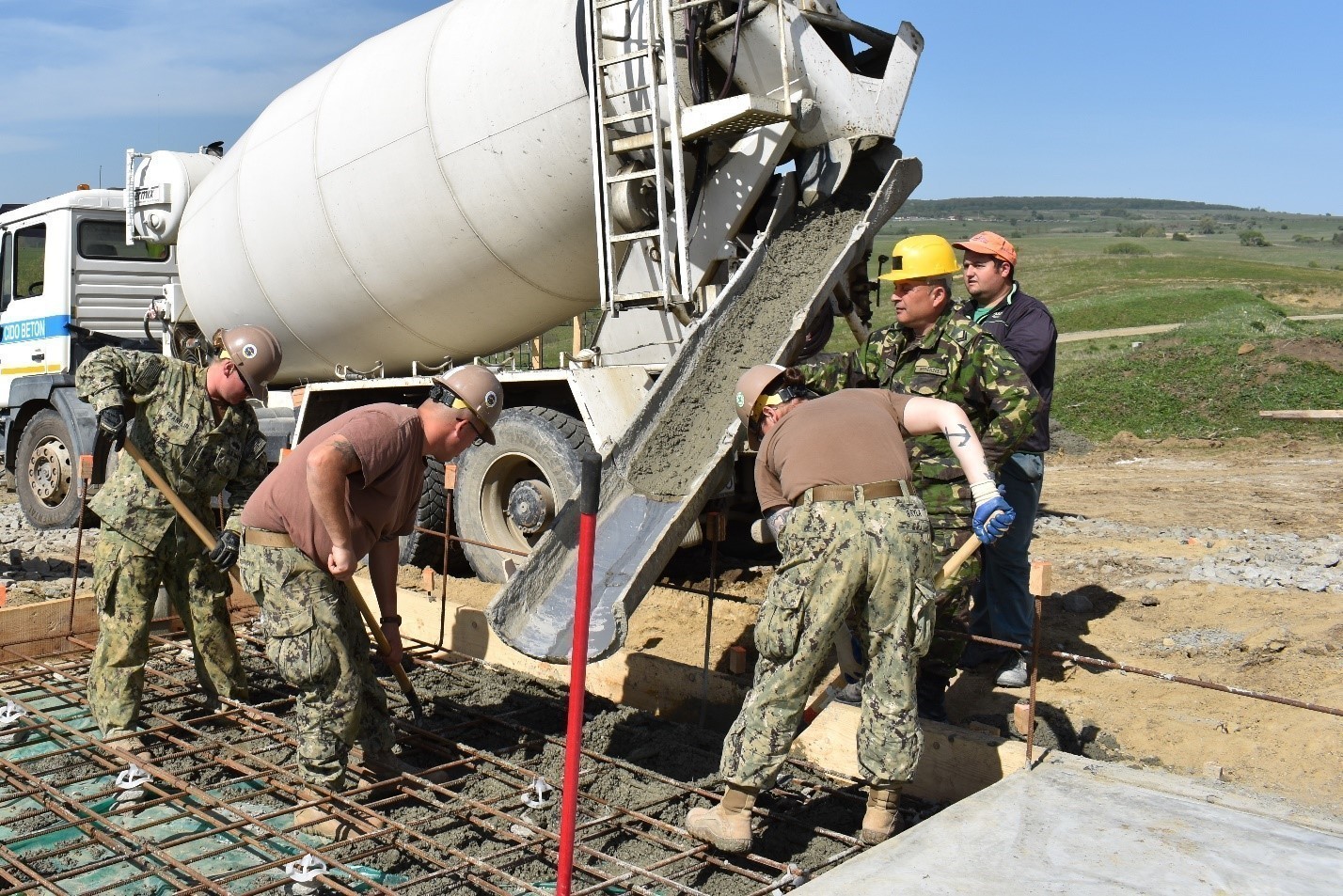 Builder 3rd Class Amanda Bryla, Builder 3rd Class Alexis Franklin, and Steel Worker 2nd Class Zachary McClellan of the Naval Mobile Construction Battalion 1 work with a soldier from the Romanian 10th Engineer Brigade emplace a concrete pad for an Operations and Storage Building as a part of Resolute Castle 17 at Joint National Training Center, Cincu, Romania. Resolute Castle 17 is an exercise strengthening the NATO alliance and enhancing its capacity for joint training and response to threats within the region.