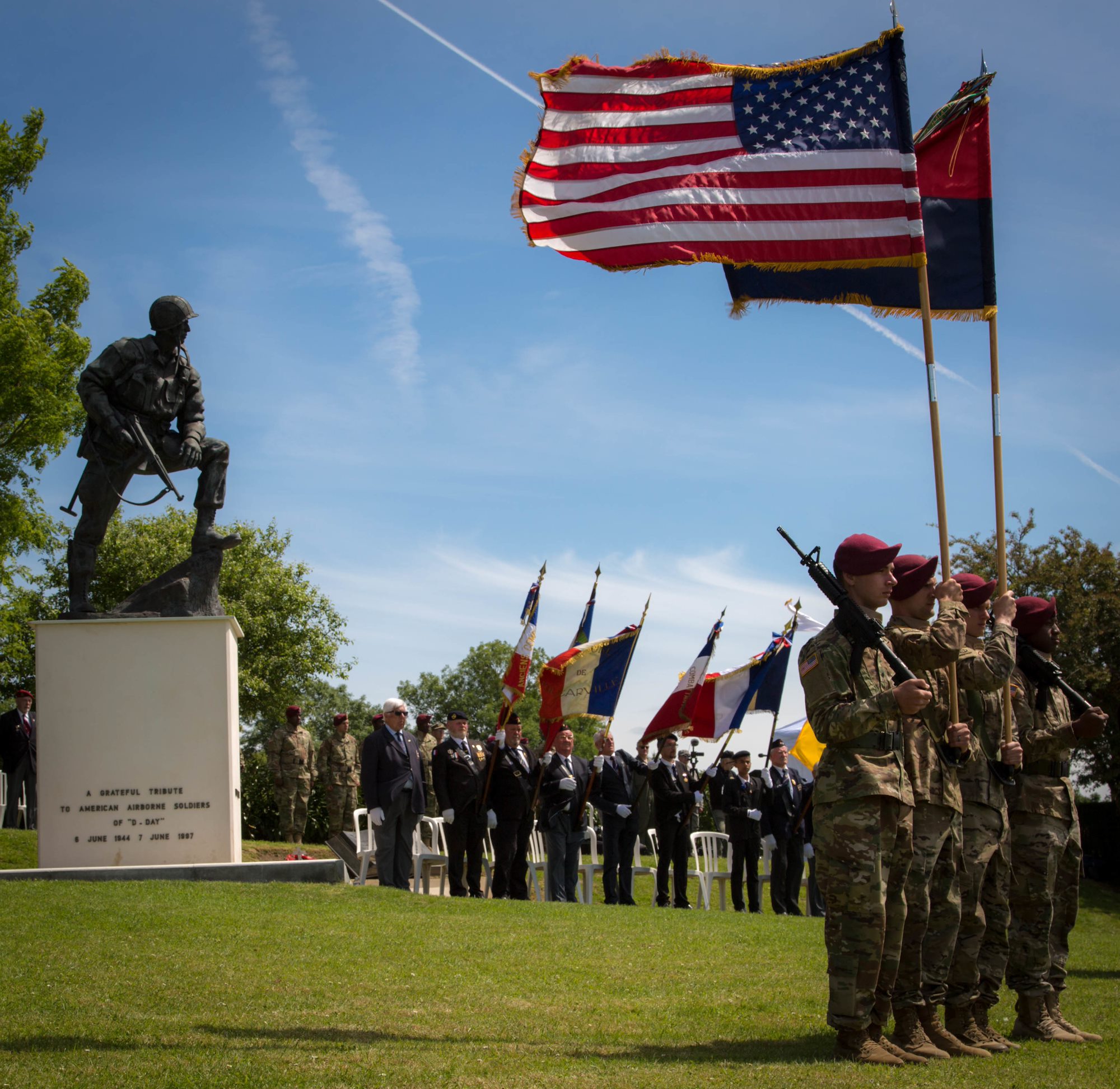 Soldiers of the 82nd Airborne Division serve as Color Guard for the "Iron Mike" dedication in St. Mere-Eglise, France. U.S. Army photo by Spc. Joseph Agacinski/released.