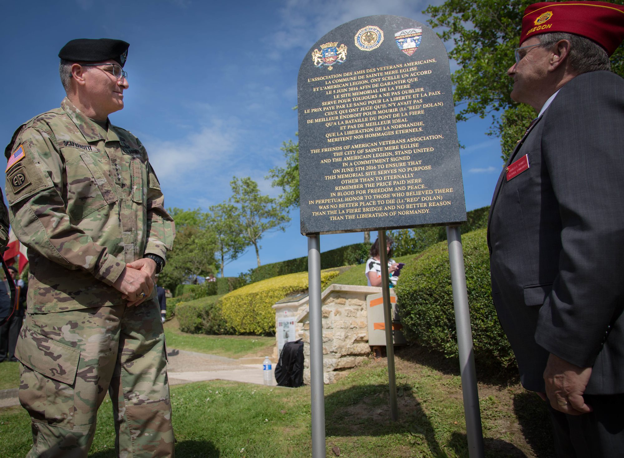 General Scaparrotti, along with the American Legion, was on hand to assist in dedicating a memorial plaque at the Iron Mike memorial in St. Mere-Eglise, France, close to where the Airborne soldiers would have landed 73 years ago.