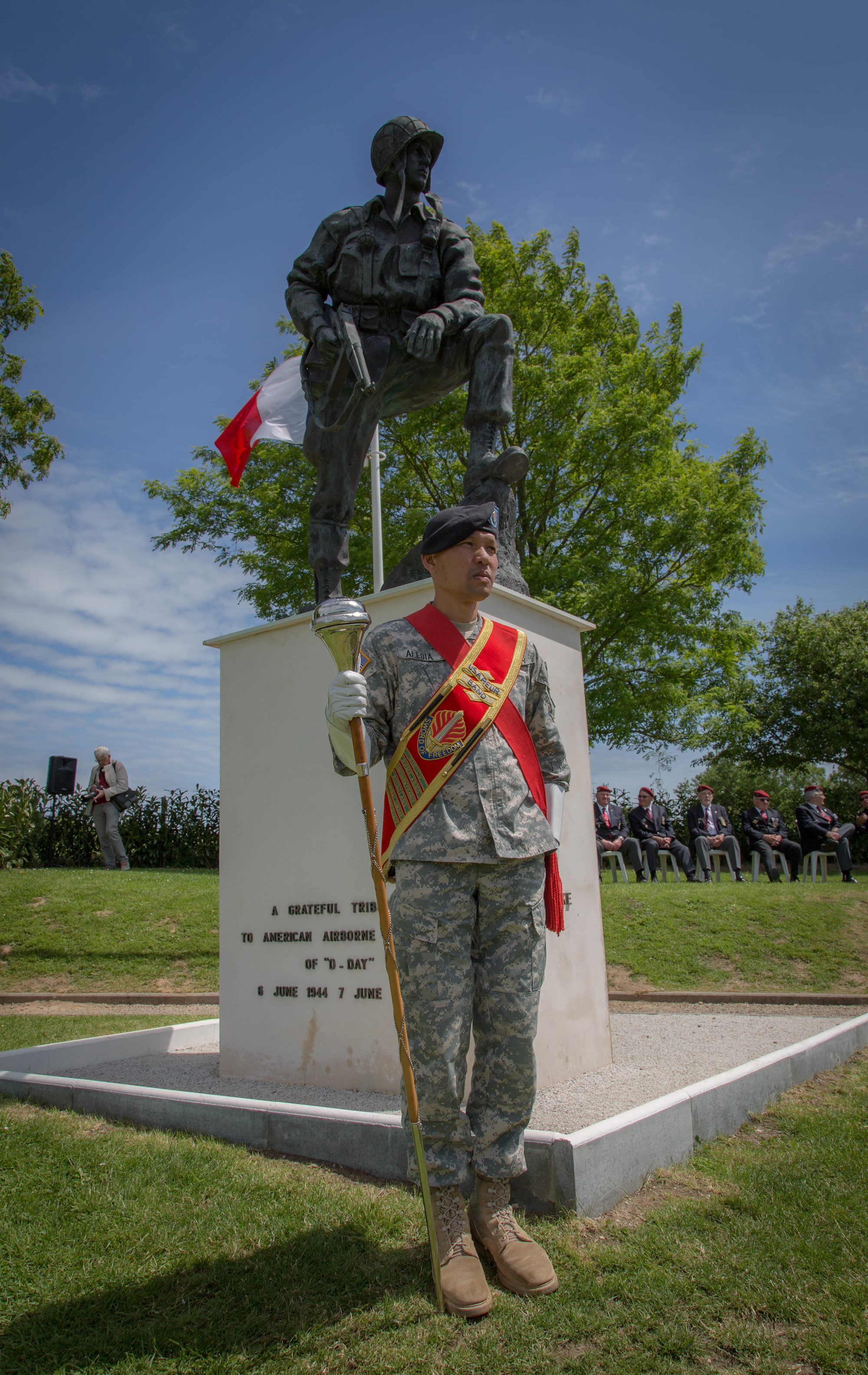 Drum Major Staff Sgt. Redentor Aledia stands with the "Iron Mike" memorial in St. Mere-Eglise, France. U.S. Army photo by Spc. Joseph Agacinski/released.