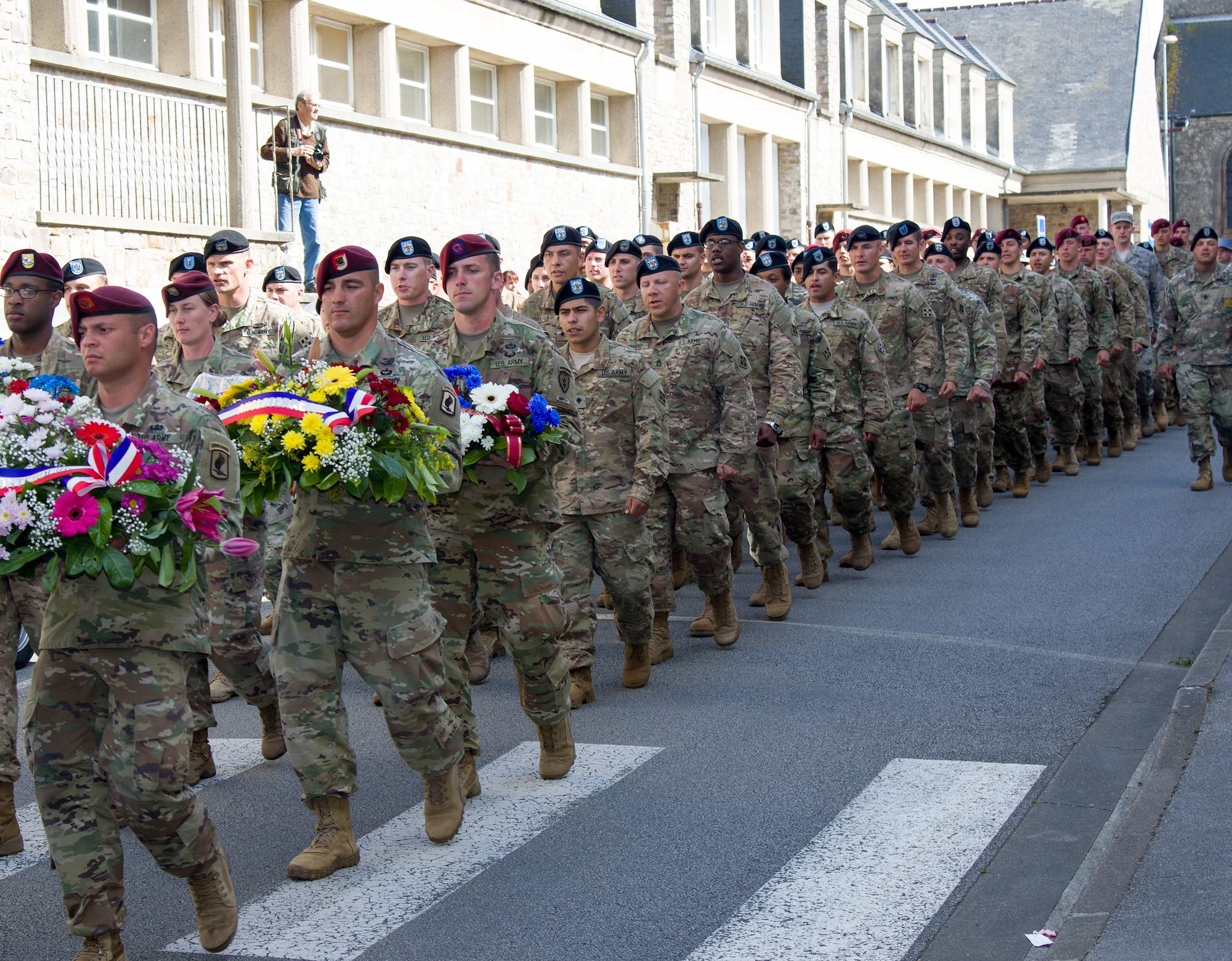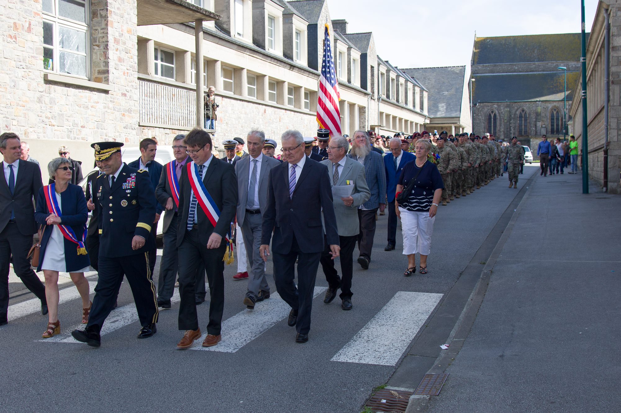 MONTEBOURG, France--More than 100 U.S. Army Soldiers, join the commanding general, French compatriots and people of Montebourg, France, during a march from the town center to the town's World War II memorial wall. Select Soldiers from "Fighting Eagles," 1st Battalion, 8th Infantry Regiment of the 3rd Armored Brigade Combat Team, 4th Inf. Div., participated in the march to the memorial dedication hosted by Maj. Gen. Ryan F. Gonsalves, commanding general of the 4th Inf. Div., Monteburg civic leaders, French compatriots and veterans. The Soldiers of 3rd ABCT are currently deployed in support of Operation Atlantic Resolve, U.S. forces' commitment to the collective security of eastern Europe, conducting bilateral training and multinational exercises with NATO Allies and Partners. The last time the 1st Bn., 8th Inf. Regt. deployed to Europe the Fighting Eagle Soldiers landed at Utah Beach with the Assault Division on D-Day in 1944. The 1st Bn., 8th Inf. Regt., currently stationed in Romania, sent Soldiers who had recently earned the Expert Infantryman's Badge during testing earlier this year. The Soldiers served as guests of honor at the ceremony, where Gonsalves and community leaders laid wreaths at the memorial.