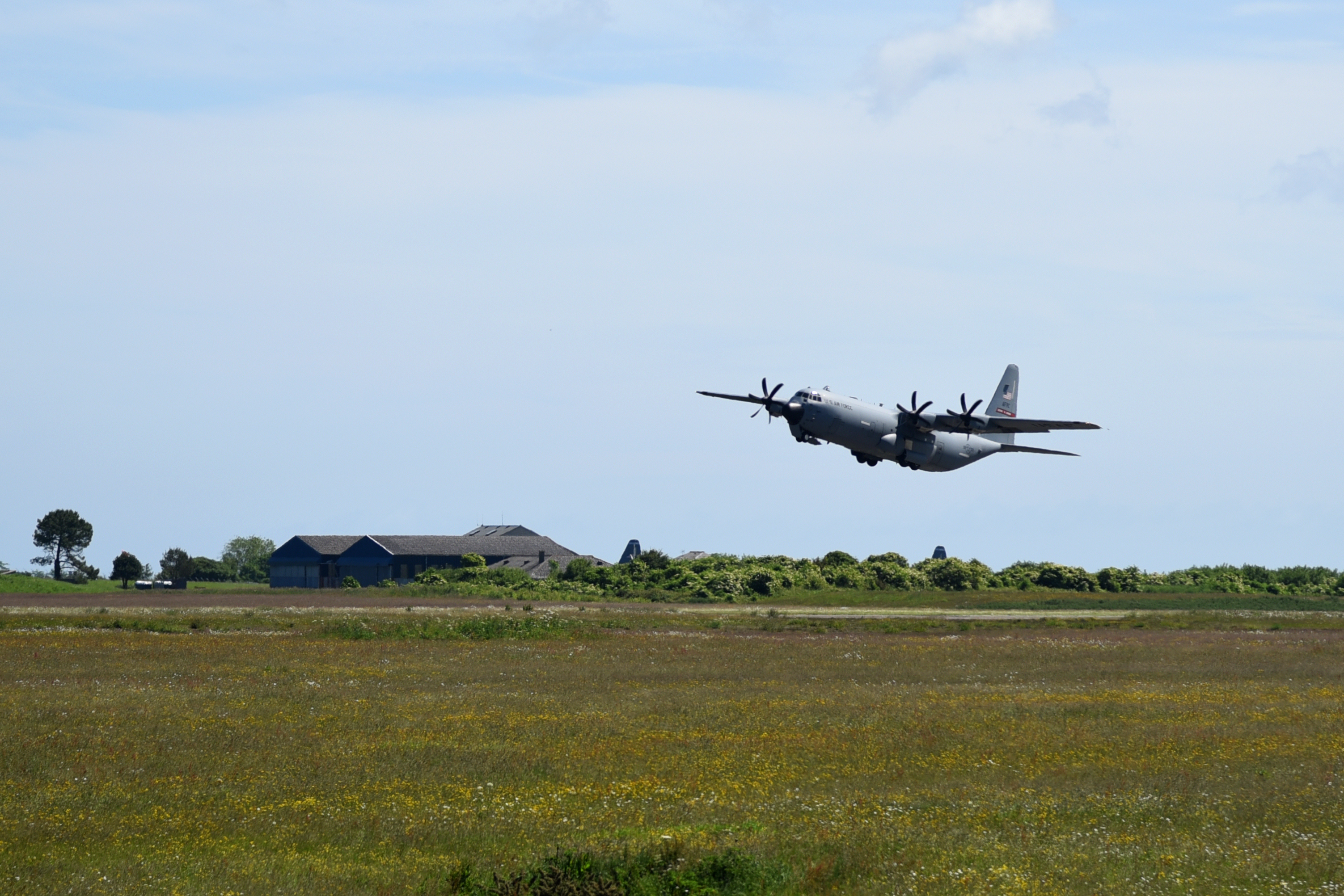 A crew from the 815th Airlift Squadron take off to conduct a 4-ship flyover at a ceremony in Normandy. This ceremony commemorates the 73rd anniversary of D-Day, the largest multi-national amphibious landing and operational military airdrop in history, and highlights the U.S.' steadfast commitment to European allies and partners. Overall, approximately 400 U.S. service members from units in Europe and the U.S. are participating in ceremonial D-Day events from May 31 to June 7, 2017(U.S. Air Force photo by Staff Sgt. Nicholas Monteleone)