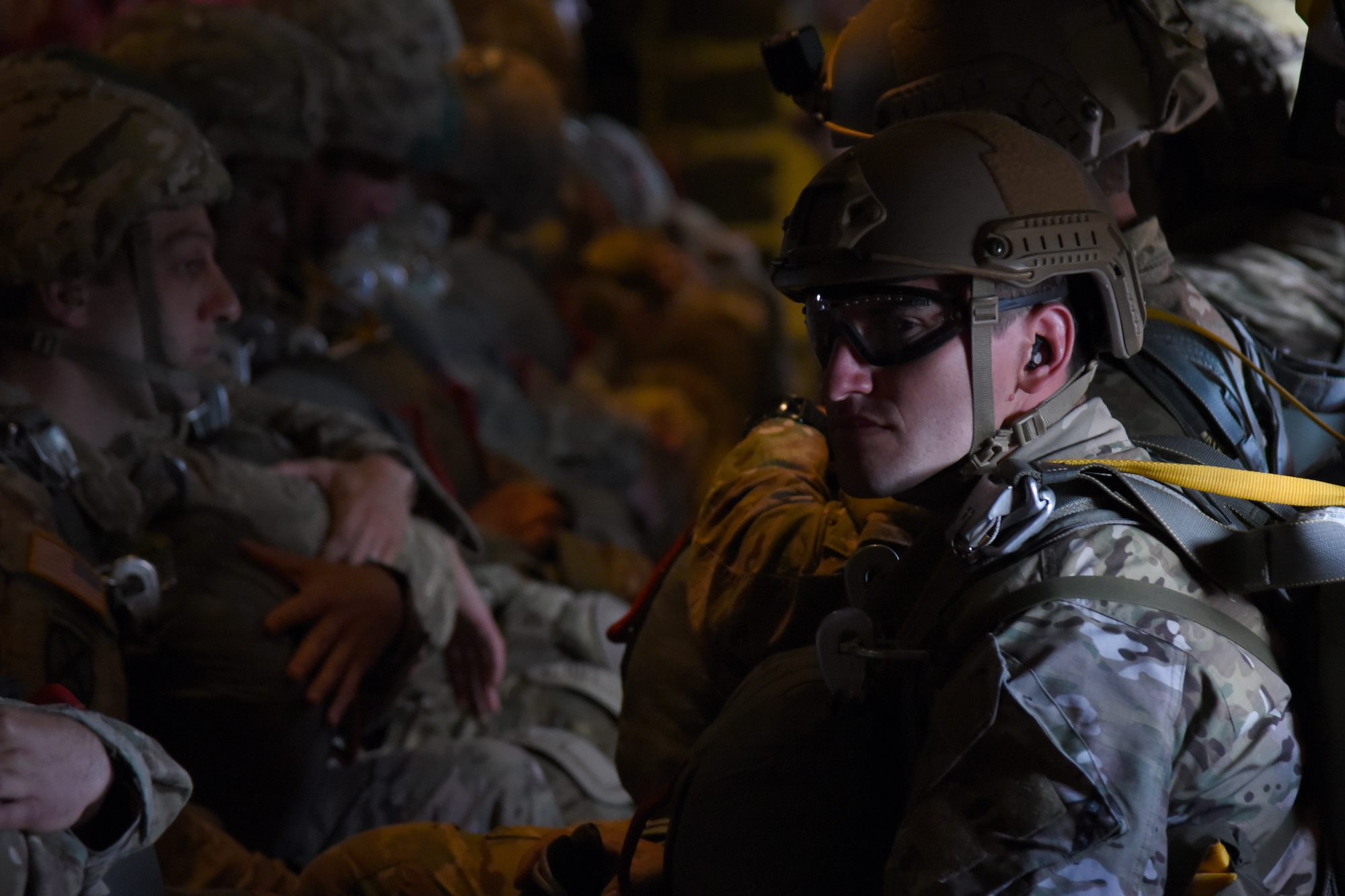 Paratroopers await their jump from an 815th Airlift Squadron C-130J over Normandy, France. This event commemorates the 73rd anniversary of D-Day, the largest multi-national amphibious landing and operational military airdrop in history, and highlights the U.S.' steadfast commitment to European allies and partners. Overall, approximately 400 U.S. service members from units in Europe and the U.S. are participating in ceremonial D-Day events from May 31 to June 7, 2017(U.S. Air Force photo by Staff Sgt. Nicholas Monteleone)