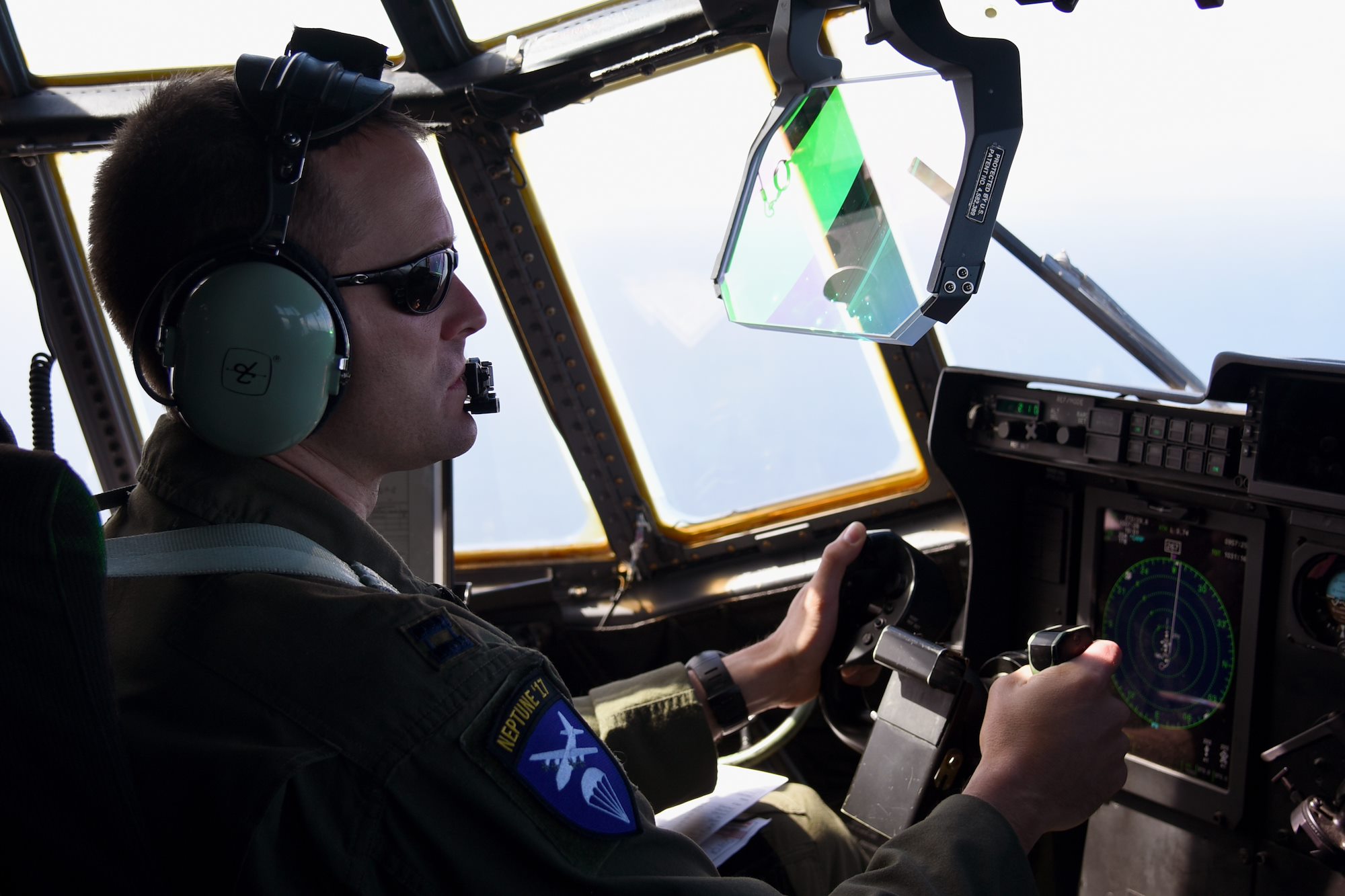 Capt. Nick Foreman, pilot for the 815th Airlift Squadron flies toward the drop zone for a paratroop drop over Normandy, France. This event commemorates the 73rd anniversary of D-Day, the largest multi-national amphibious landing and operational military airdrop in history, and highlights the U.S.' steadfast commitment to European allies and partners. Overall, approximately 400 U.S. service members from units in Europe and the U.S. are participating in ceremonial D-Day events from May 31 to June 7, 2017(U.S. Air Force photo by Staff Sgt. Nicholas Monteleone)