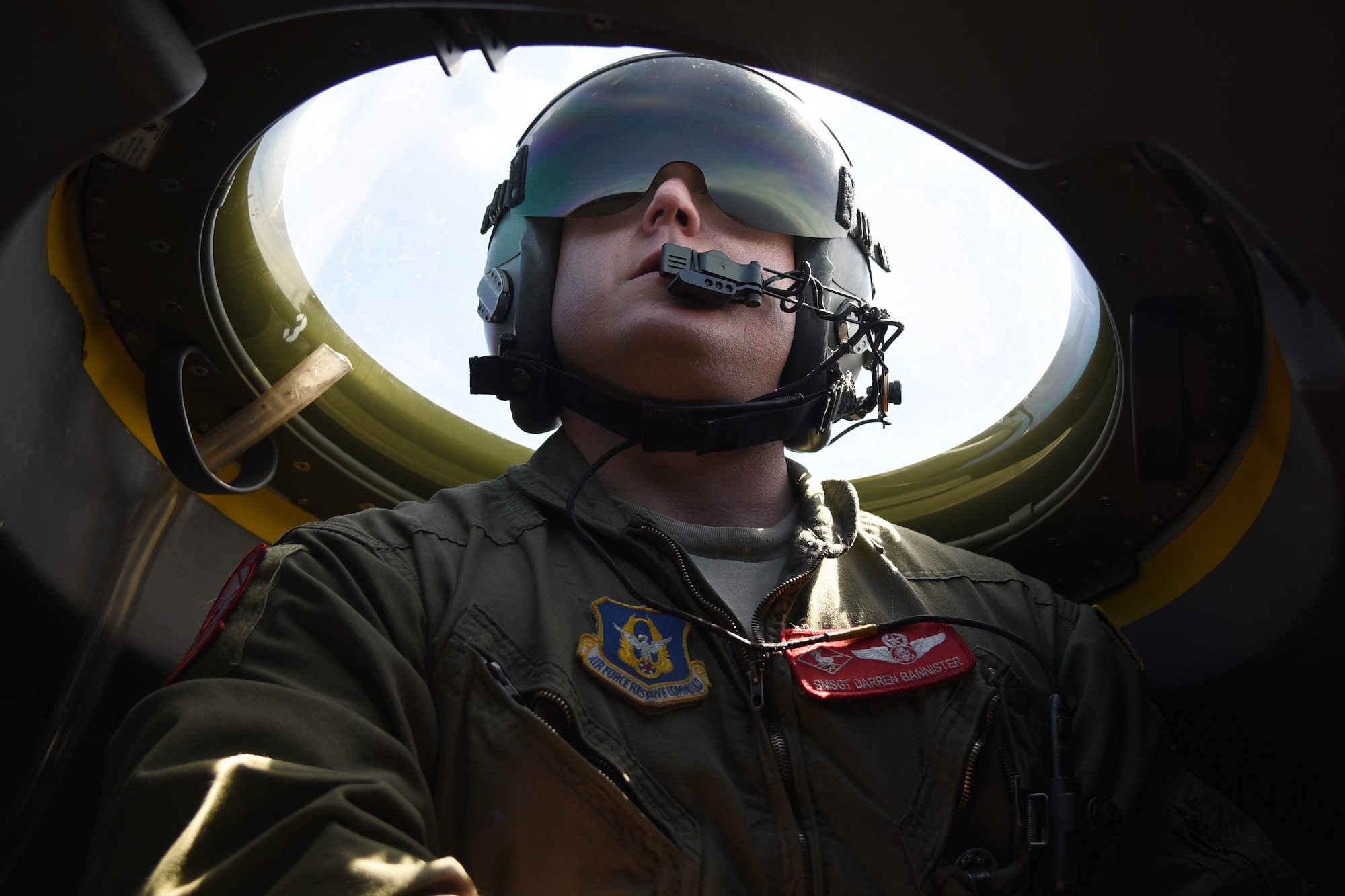 Senior Master Sgt. Darren Bannister, loadmaster with the 815th Airlift Squadron looks out of the bubble on the flight deck while taking part in a paratroop drop over Normandy, France. This event commemorates the 73rd anniversary of D-Day, the largest multi-national amphibious landing and operational military airdrop in history, and highlights the U.S.' steadfast commitment to European allies and partners. Overall, approximately 400 U.S. service members from units in Europe and the U.S. are participating in ceremonial D-Day events from May 31 to June 7, 2017(U.S. Air Force photo by Staff Sgt. Nicholas Monteleone)