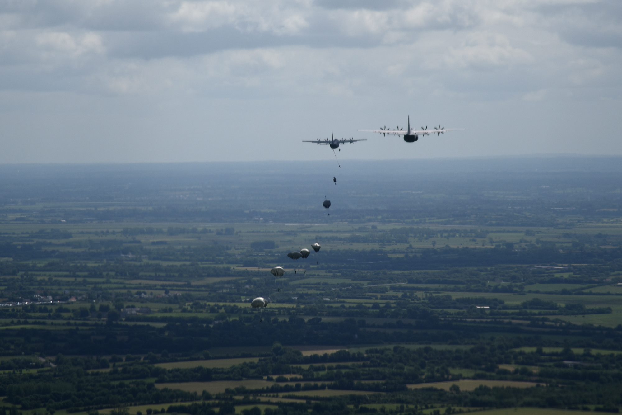 Paratroops jump from C-130J aircraft during a six-ship troop drop over Normandy, France. This event commemorates the 73rd anniversary of D-Day, the largest multi-national amphibious landing and operational military airdrop in history, and highlights the U.S.' steadfast commitment to European allies and partners. Overall, approximately 400 U.S. service members from units in Europe and the U.S. are participating in ceremonial D-Day events from May 31 to June 7, 2017(U.S. Air Force photo by Staff Sgt. Nicholas Monteleone)