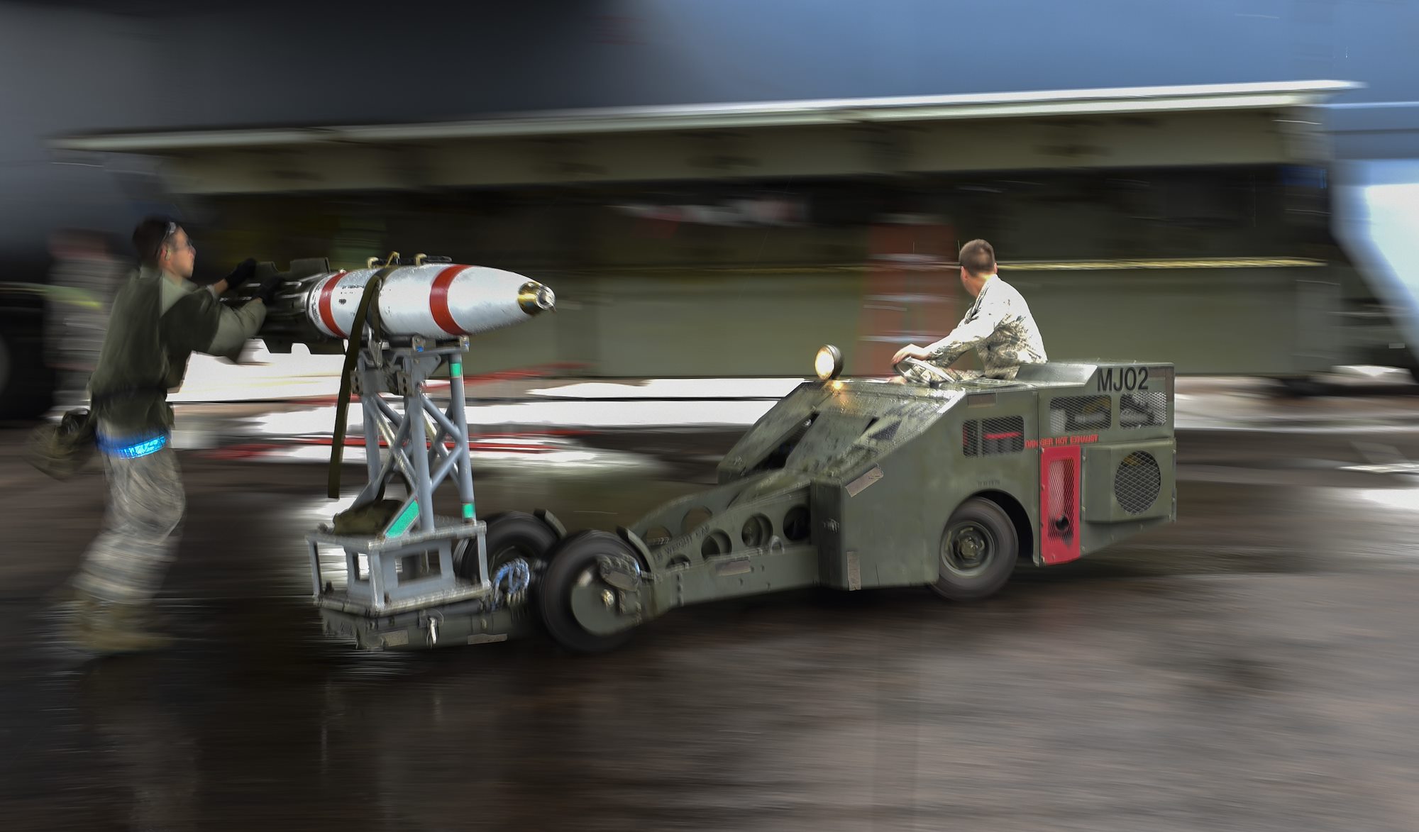 U.S. Air Force Senior Airman Michael Ruiz, left, and Airman 1st Class Nathaniel Martin, 2nd Aircraft Maintenance Squadron weapons load crew members, transport an inert, (non-explosive) Quick Strike MK 62 mine into the bomb bay of a B-52H Stratofortress at RAF Fairford, England, June 5, 2017. Bomber crews participated in BALTOPS 2017, an annual, multinational, maritime-focused exercise designed to strengthen interoperability and cohesiveness between NATO allies and partnered nations. (U.S. Air Force photo by Airman 1st Class Randahl J. Jenson)